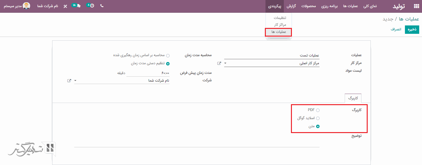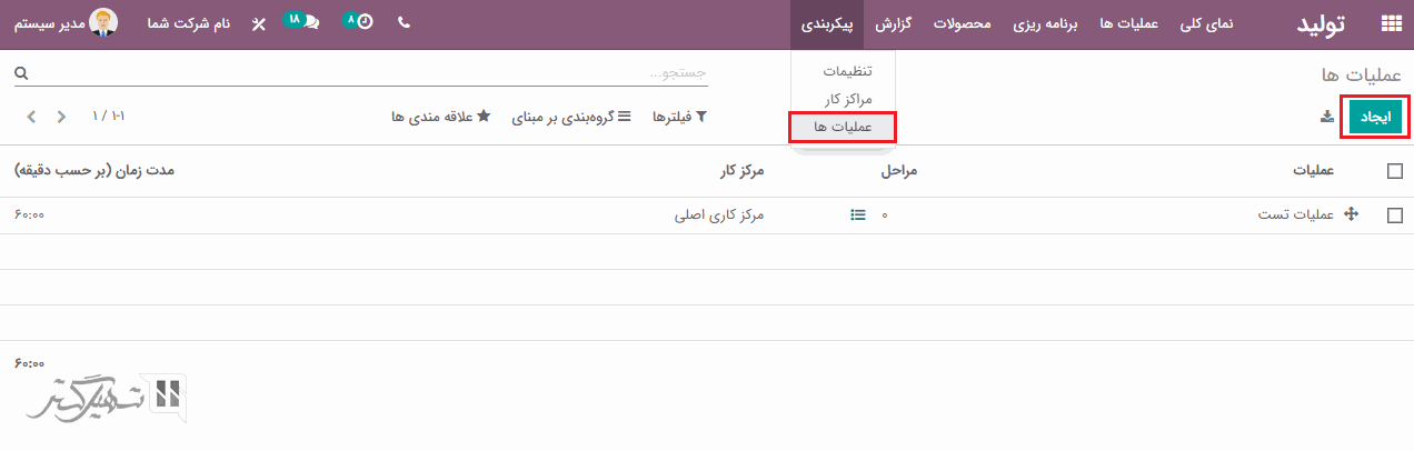 عملیات را می توان از طریق ماژول تولید> پیکربندی> عملیات ها> کلیک بر روی دکمه "ایجاد"، ایجاد کرد.