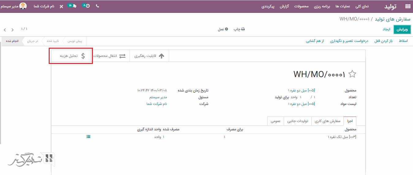 بله، هنگامی که سفارش تولید را تایید و انجام شده علامت گذاری می کنید، یک دکمه جدید "تحلیل هزینه" در بالای صفحه ظاهر می شود. اگر بر روی آن کلیک کنید، جزئیاتی مانند ساختار هزینه محصول، هزینه اجزا را ارائه می دهد.