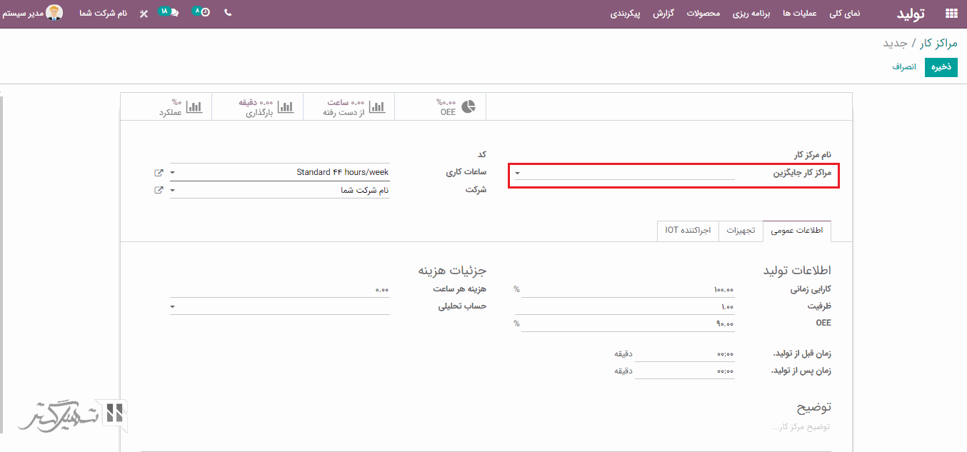هنگام ایجاد مرکز کار، می توانید یک مرکز کار جایگزین برای آن نیز انتخاب کنید. با این کار، هر زمان که فرآیندی به این مرکز کار احتیاج داشته باشد اما مرکز کار در دسترس نباشد یا به عملیات دیگری مشغول باشد، از مرکز کار جایگزین برای پردازش عملیات به نمایندگی از آن استفاده خواهد شد.