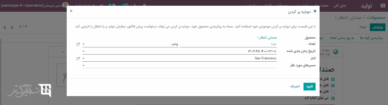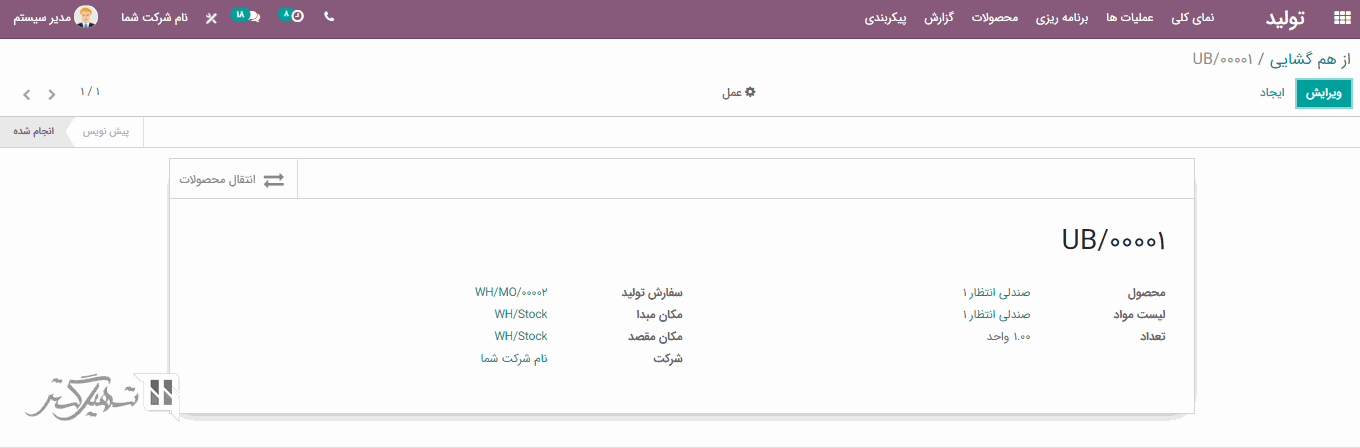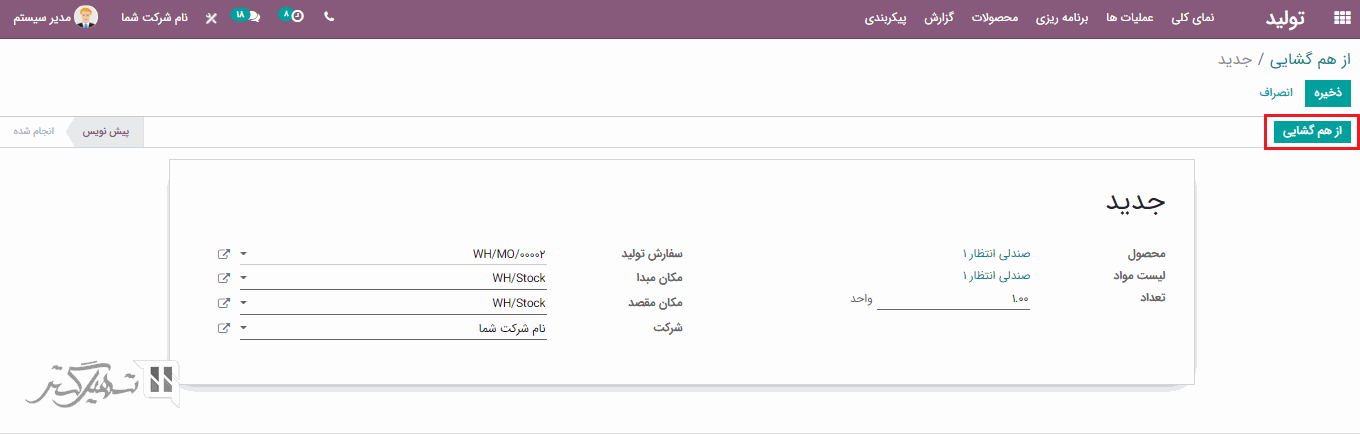در فرم ایجاد فیلدهای محصول، مکان مبدا، مکان مقصد، سری ساخت / شماره سریال و سفارش تولید را پر کنید، سپس بر روی دکمه "از هم گشایی" کلیک کنید.