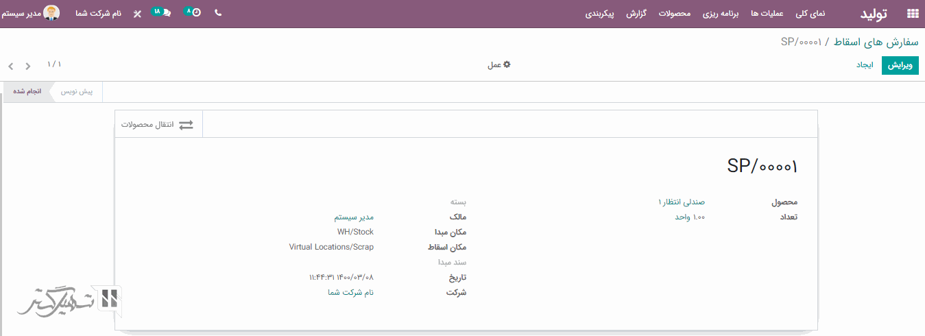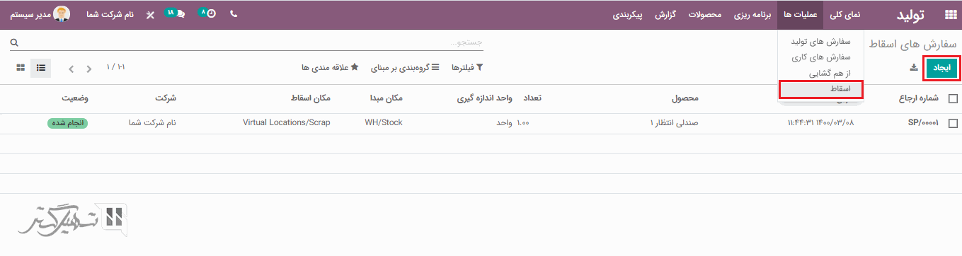 ویژگی اسقاط به انتقال محصول آسیب دیده از محل انبار به محل قراضه کمک می کند. به ماژول تولید> عملیات ها> اسقاط بروید و بر روی دکمه "ایجاد" کلیک کنید.