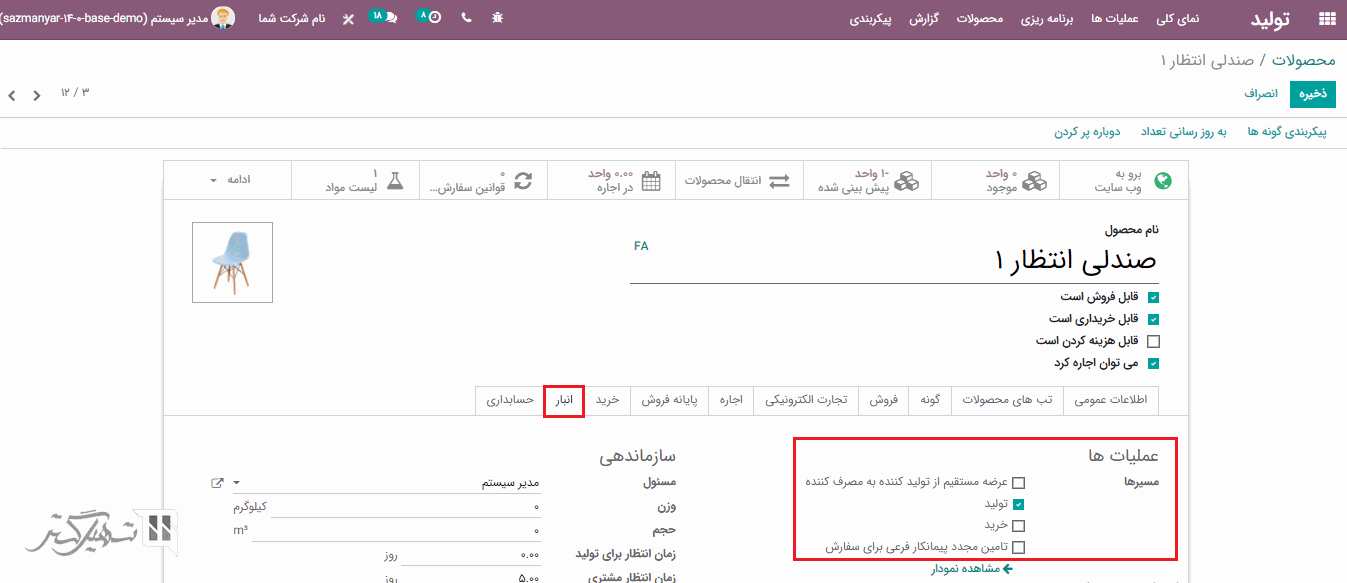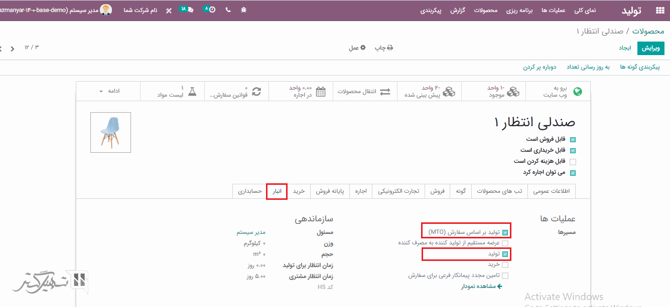 در فرم محصول> تب انبار ، باید مسیر "تولید" را برای انجام فرآیند تولید فعال کنید: