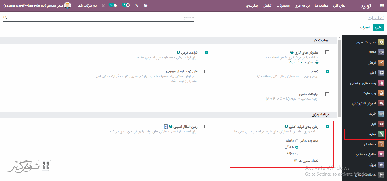 MPS (زمانبندی اصلی تولید)، ابزاری است که اودوو در نسخه اینترپرایز برای برنامه ریزی تولید براساس تقاضای پیش بینی شده ارائه داده است. برای فعالسازی این ویژگی، به ماژول تولید> پیکربندی> تنظیمات> تب برنامه ریزی بروید و گزینه "زمان بندی تولید اصلی" را فعال کنید:
