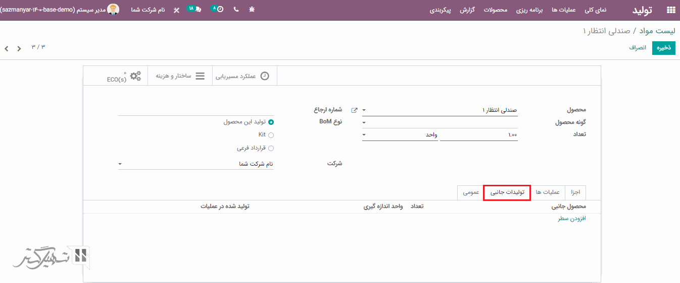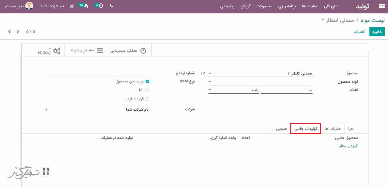 محصولات جانبی که ممکن است در نتیجه تولید ایجاد شوند، می توان در تب تولیدات جانبی اضافه کرد:
