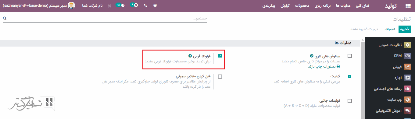 از قرارداد فرعی برای سفارش دادن به پیمانکار فرعی برای تولید محصول از طرف ما استفاده می شود است. ابتدا به ماژول تولید> پیکربندی> تنظیمات> تب عملیات ها بروید و گزینه "قرارداد فرعی" را فعال کرده، سپس بر روی دکمه "ذخیره" کلیک کنید.