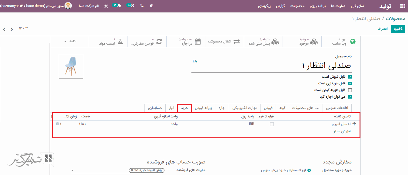قدم بعدی پیکربندی محصول است، برای پیمانکاری یک محصول به ماژول تولید> محصولات بروید و محصول مربوطه را انتخاب کنید، در تب انبار گزینه "تامین مجدد پیمانکار فرعی برای سفارش" را برای مسیرها انتخاب نمایید، سپس در تب خرید ، تامین کنندگان را اضافه کرده و بر روی دکمه "ذخیره" کلیک کنید: