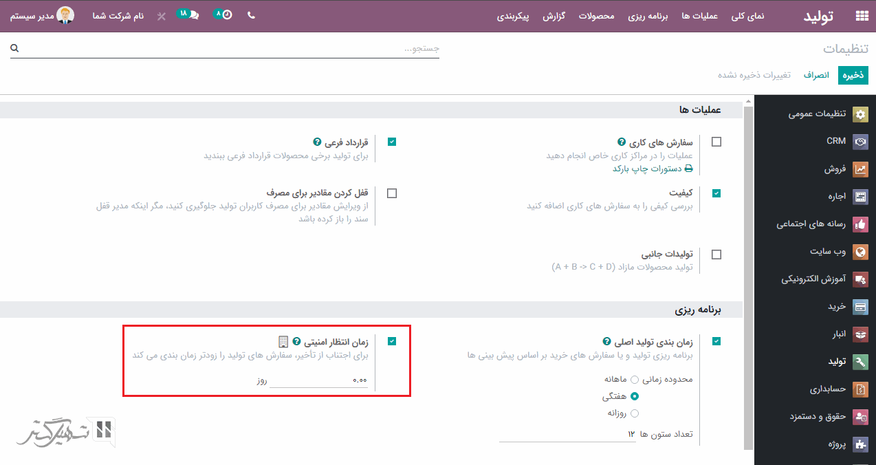 روش دیگر، افزودن زمان انتظار امنیتی برای زمانبندی زودتر سفارشات تولید برای جلوگیری از تأخیر است. زمان تولید امنیتی را می توان از طریق ماژول تولید> پیکربندی> تنظیمات> تب برنامه ریزی ، فعال کرد: