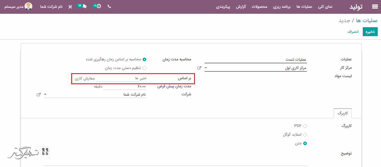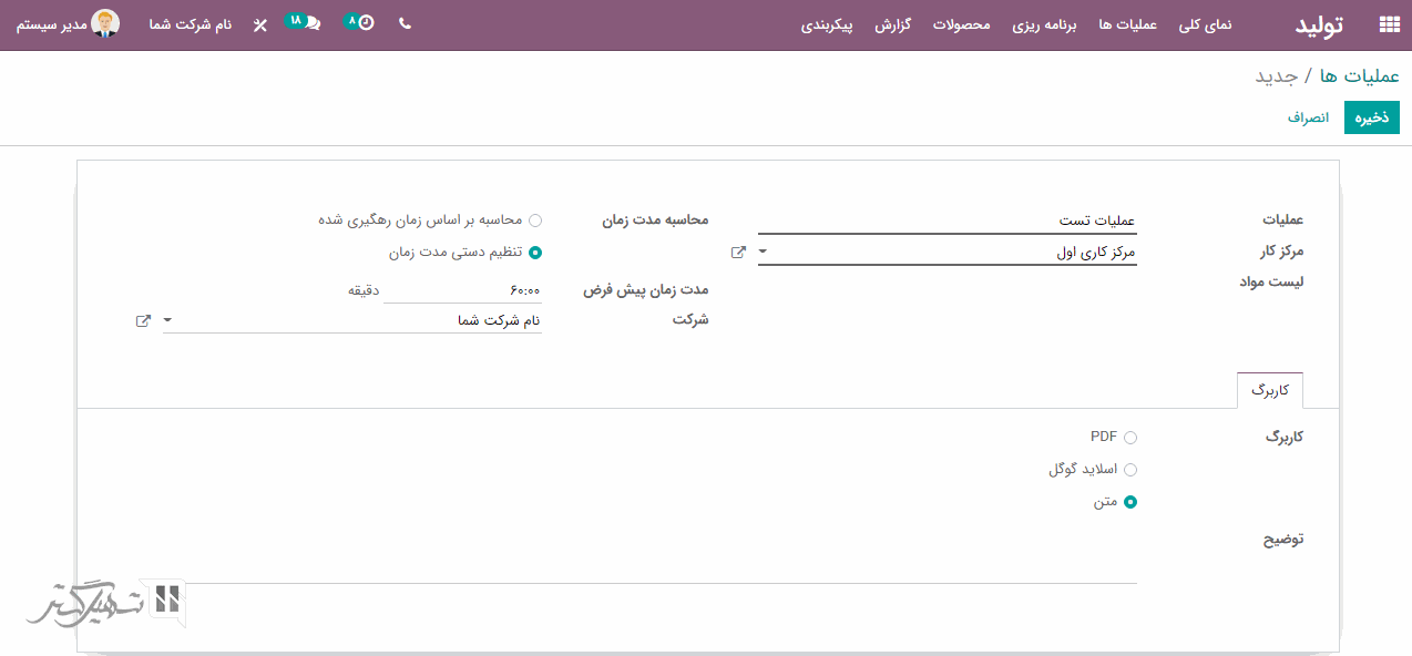 در ابتدا، یک نام برای عملیات و مرکز کاری که باید عملیات در آن انجام شود، اضافه کنید. علاوه بر آن، شما می توانید محاسبه مدت زمان را بر اساس (محاسبه بر اساس زمان رهگیری شده/ تنظیم دستی مدت زمان) انتخاب نمایید: