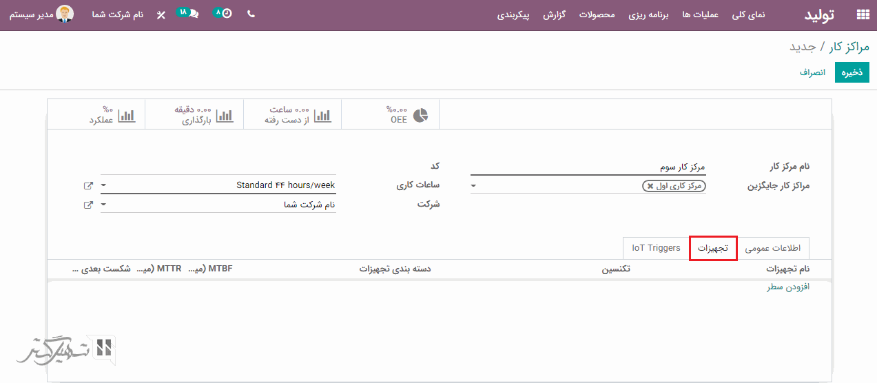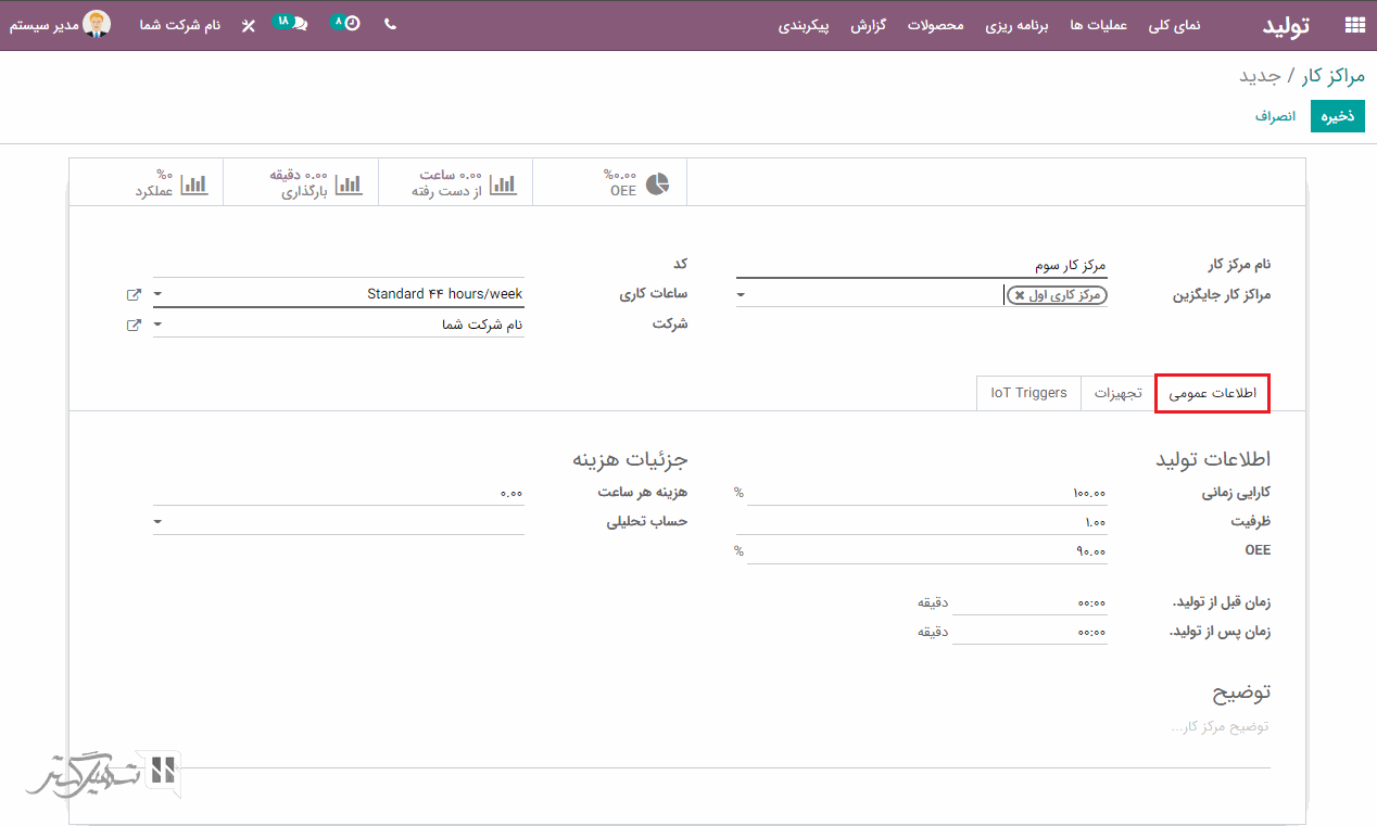 در تب اطلاعات عمومی، اطلاعات تولید و جزئیات هزینه را مانند کارایی زمان، OEE، ظرفیت، هزینه هر ساعت، زمان قبل از تولید و بعد از تولید اضافه کنید. علاوه بر این، می توانید جزئیات تجهیزات مورد نیاز برای تولید را در تب تجهیزات اضافه نمایید: