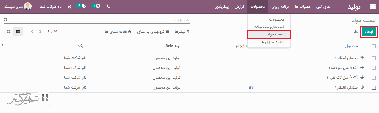برای تولید یک محصول، ابتدا باید یک لیست مواد برای آن پیکربندی کنید. به ماژول تولید> محصولات> لیست مواد بروید و بر روی دکمه "ایجاد" کلیک کنید.