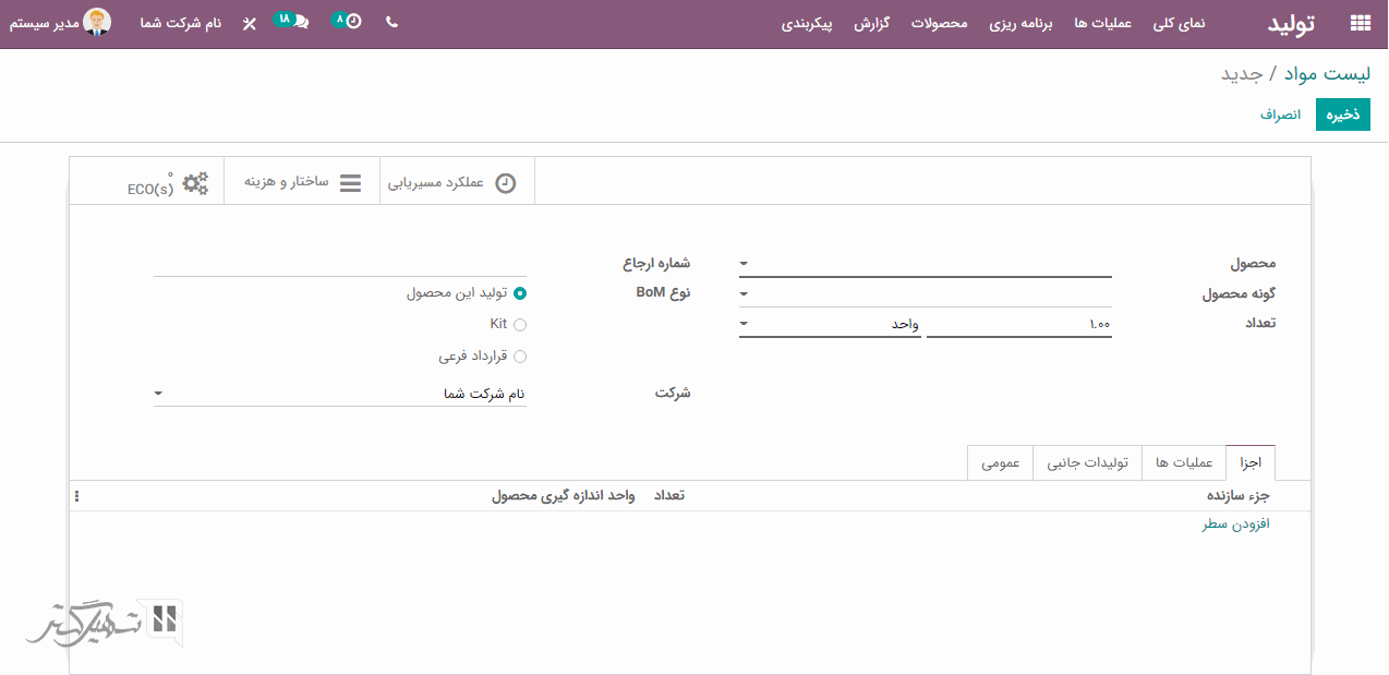 ، می توانید اجزای مورد نیاز برای تولید محصولات، تعداد و واحد اندازه گیری را اضافه نمایید: