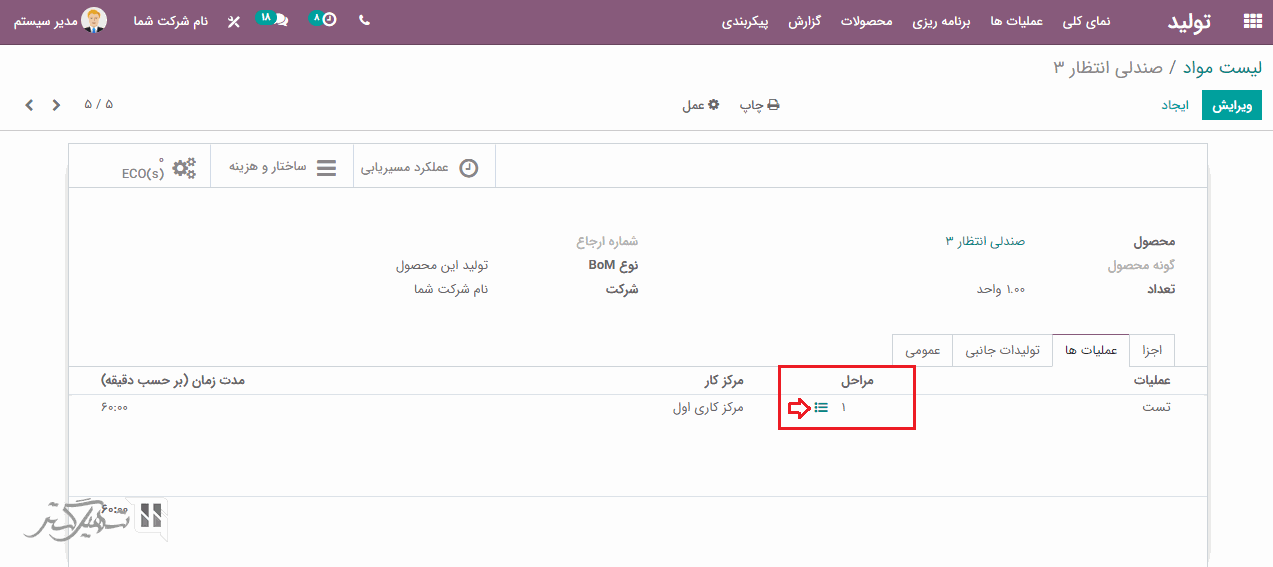 در تب عملیات ، عملیاتی را که باید در مراکز کار مختلف انجام شود و مدت زمان مورد نیاز برای تکمیل هر عملیات را اضافه نمایید. علاوه بر این، می توانید با کلیک روی مراحل، پایانه های کنترل کیفی را اضافه و ایجاد کنید.