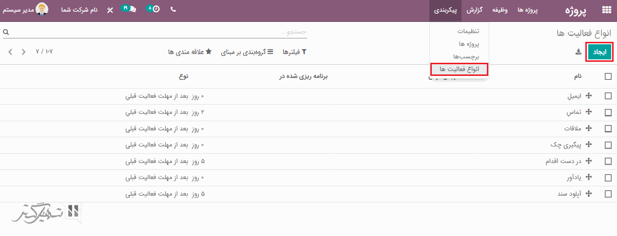 چگونه می توانم انواع فعالیت خود را در ماژول پروژه اودوو 14 ایجاد و پیکربندی کنم؟