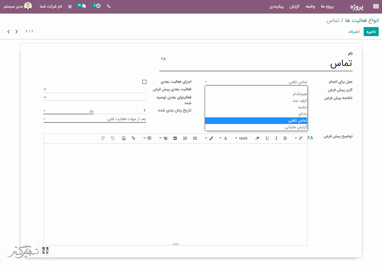 شما می توانید در فیلد عمل برای انجام ، عملیاتی مانند آپلود سند، جلسه، تماس تلفنی و غیره، را برای نوع فعالیت تعریف کنید. همچنین می توانید کاربر پیش فرض را برای نوع فعالیت تنظیم کنید، به طوری که فقط او بتواند این فعالیت ایجاد شده را ویرایش کند.