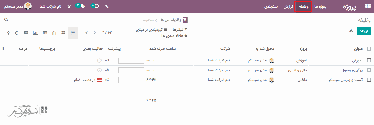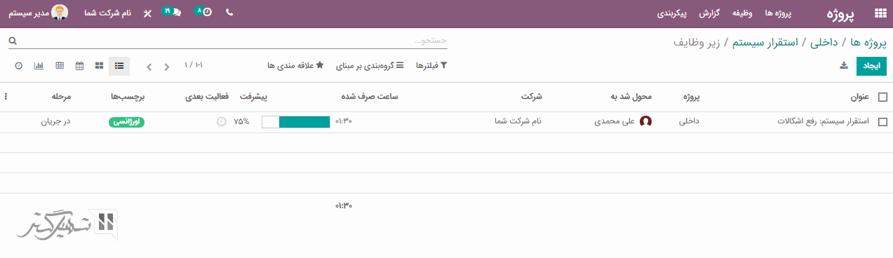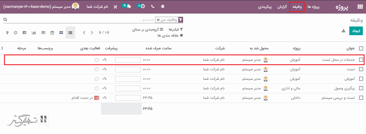 اکنون اگر به ماژول پروژه ها> وظیفه بروید، می توانید وظیفه ایجاد شده از طریق خدمات در محل را مشاهده کنید: