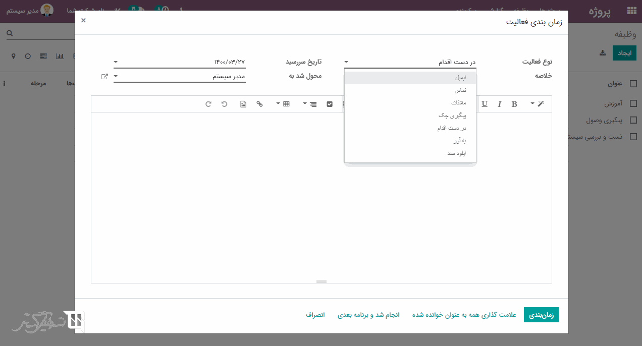 بله، فعالیت ها می توانند برای وظایف برنامه ریزی شوند. به ماژول پروژه ها> وظایف بروید، در آنجا تمامی وظایف موجود در پروژه ها قابل مشاهده است. از نمای کانبان، فعالیت بعدی را می توان برنامه ریزی کرد. اگر بر روی آیکون ساعت در فیلد فعالیت بعدی کلیک کنید، یک ویزارد در صفحه ظاهر خواهد شد در آنجا می توانید نوع فعالیت، تاریخ سررسید و شخصی که فعالیت قرار است به او محول شد، انتخاب نمایید:
