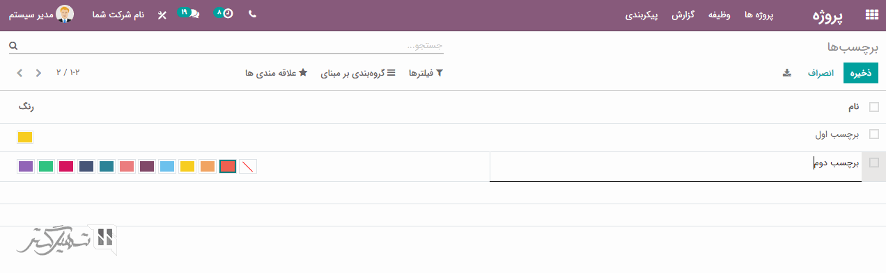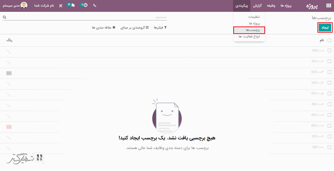 برچسب ها برای شناسایی وظایف پروژه استفاده می شوند. می توانید برچسب ها را از طریق  پروژه> پیکربندی> برچسب ها > کلیک بر روی دکمه "ایجاد"، ایجاد کنید و همراه رنگ های مختلف به پروژه های مربوطه اختصاص دهید. این به شما کمک می کند تا وظایف را به راحتی از نمای کانبان شناسایی کنید و به راحتی بر اساس برچسب ها آنها را فیلتر کنید.