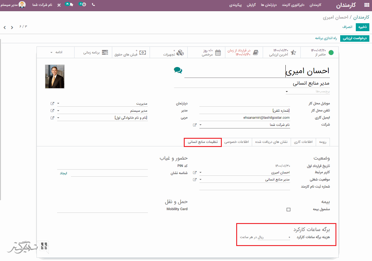 هزینه برگه ساعات کارکرد پروژه، به عنوان محصول ساعات صرف شده در برگه ساعات کارکرد و هزینه برگه ساعات کارکرد کارمند محاسبه خواهد شد. می توانید هزینه برگه ساعات کارکرد را در ماژول کارمندان> کارمندان> تب تنظیمات منابع انسانی اضافه کنید: