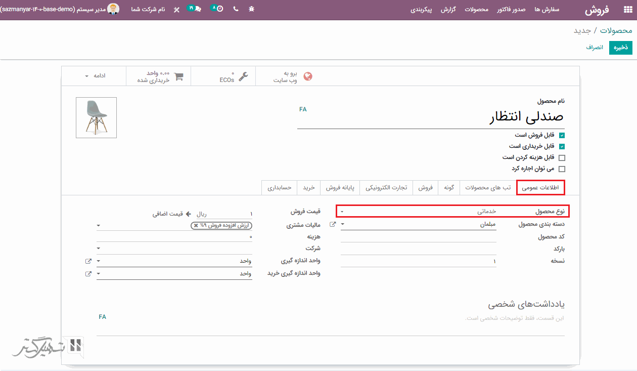 ابتدا از طریق ماژول فروش> محصولات> محصولات> کلیک بر روی دکمه "ایجاد"، یک محصول خدماتی جدید (نوع محصول را خدماتی انتخاب نمایید) ایجاد کنید: