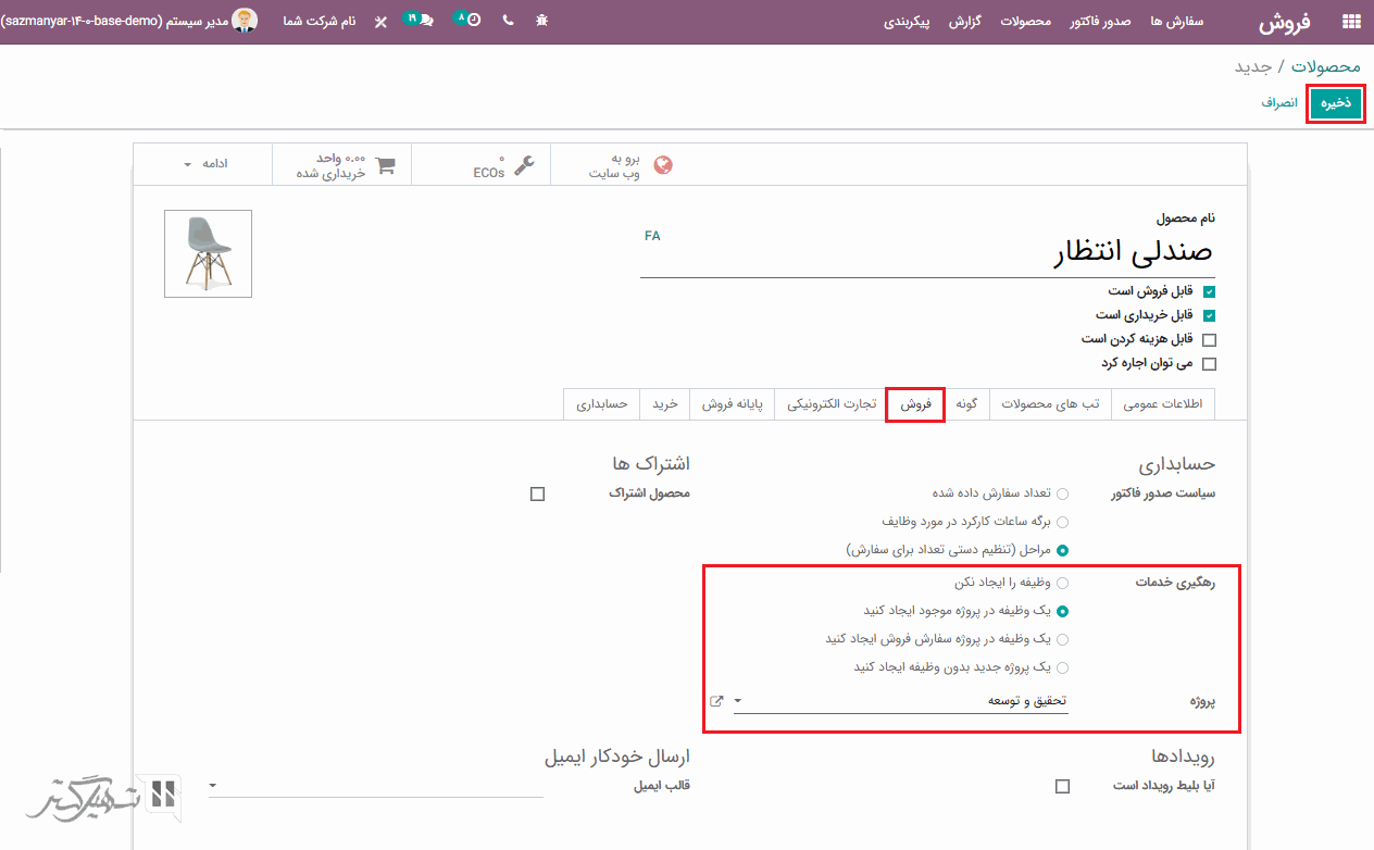 در تب فروش ، رهگیری خدمات را بر اساس "یک وظیفه در پروژه موجود ایجاد کنید" انتخاب نمایید، پروژه مربوطه را در فیلد پروژه انتخاب کرده و سپس بر روی دکمه "ذخیره" کلیک کنید: