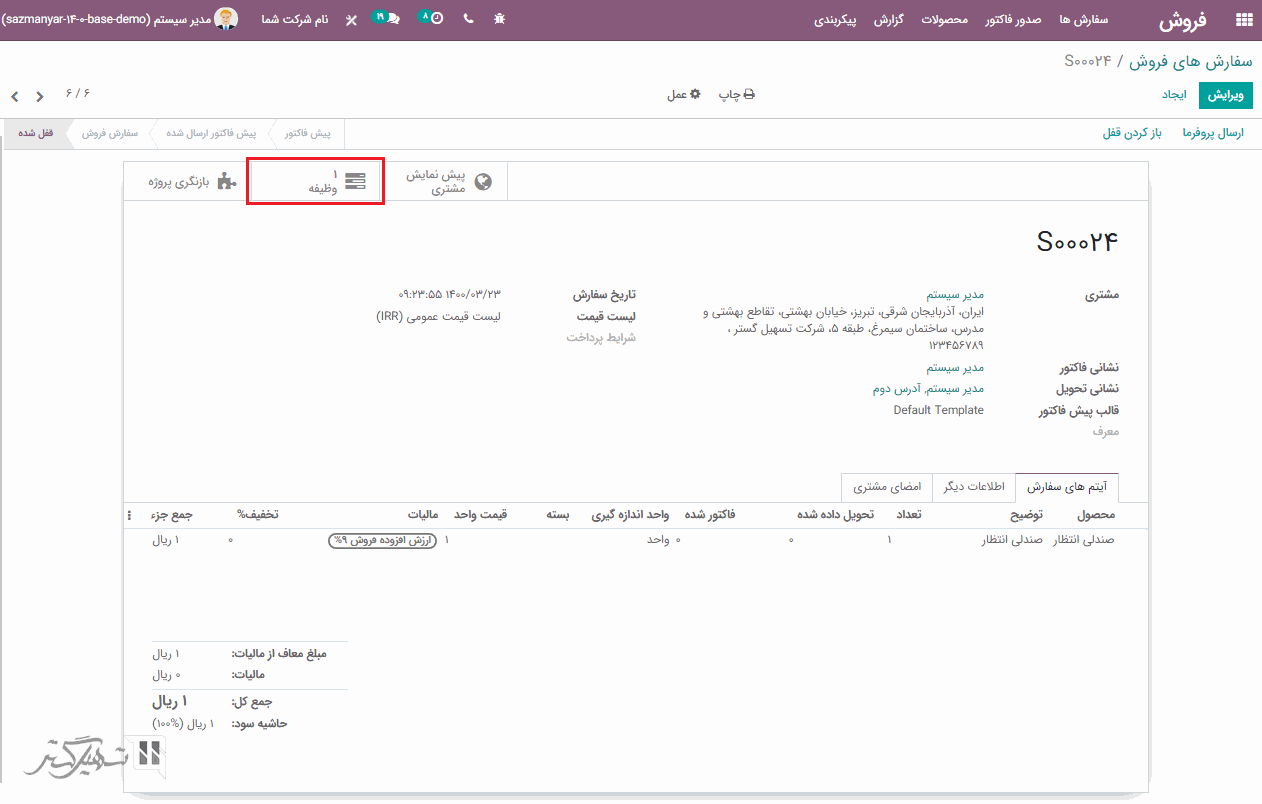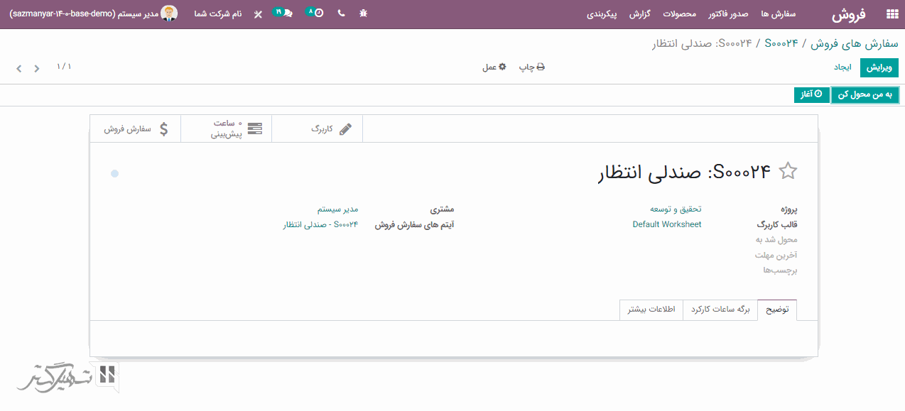 اگر این سفارش فروش را تایید کنید، یک وظیفه در پروژه برای این محصول ایجاد خواهد شد، می توانید با کلیک بر روی دکمه "وظیفه" ، جزئیات وظیفه را مشاهده نمایید: