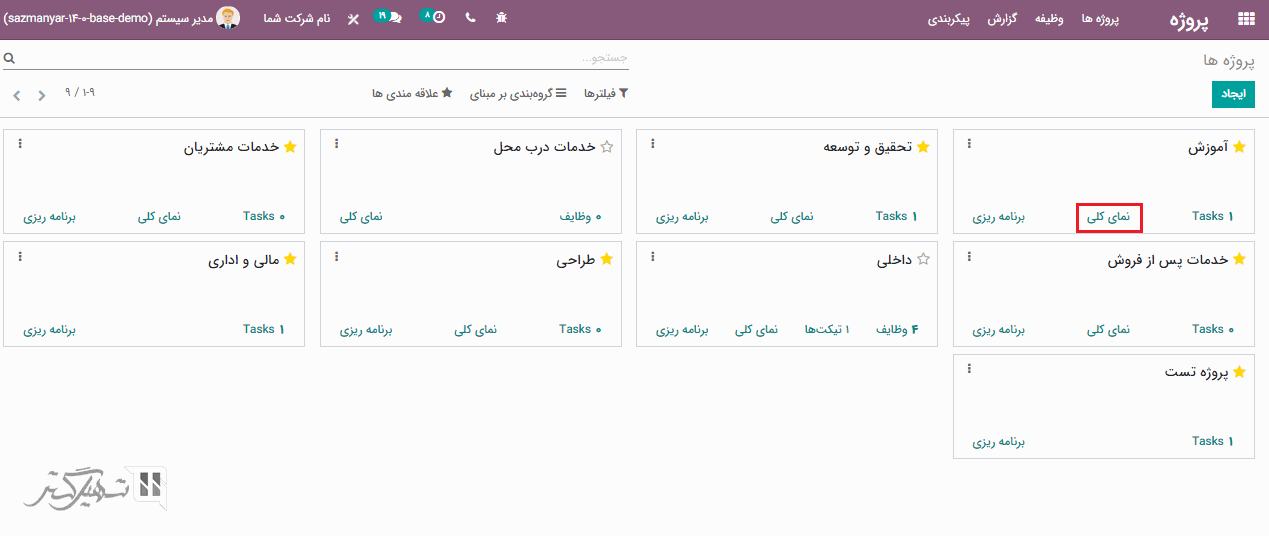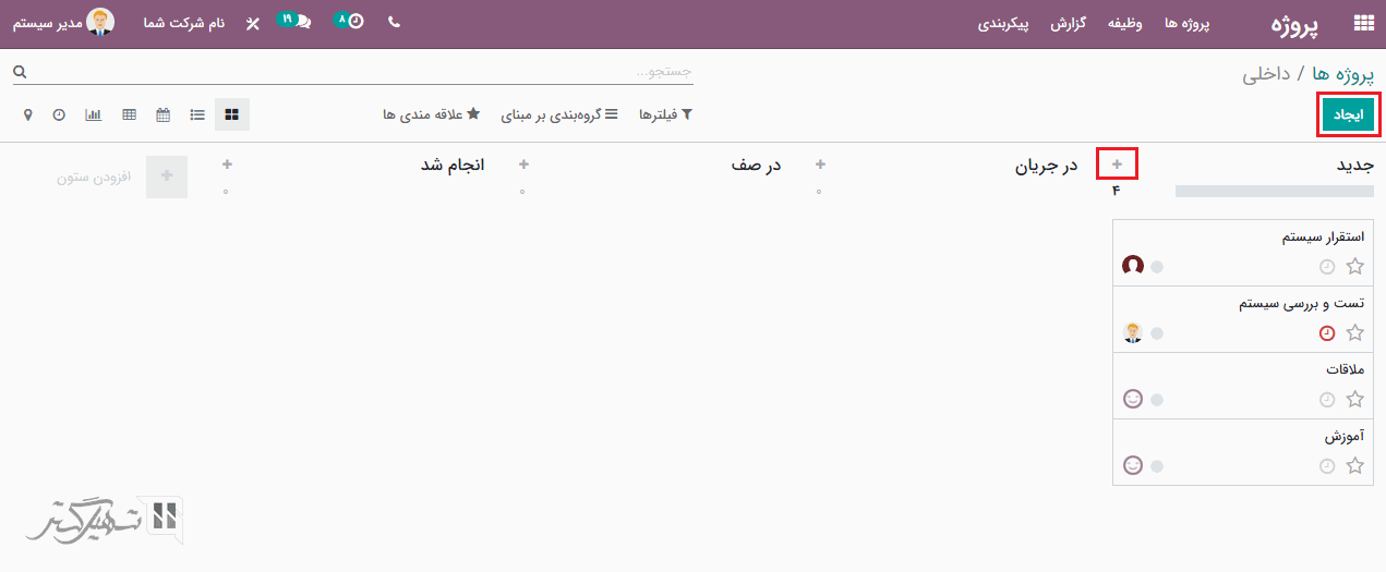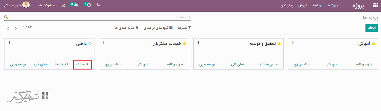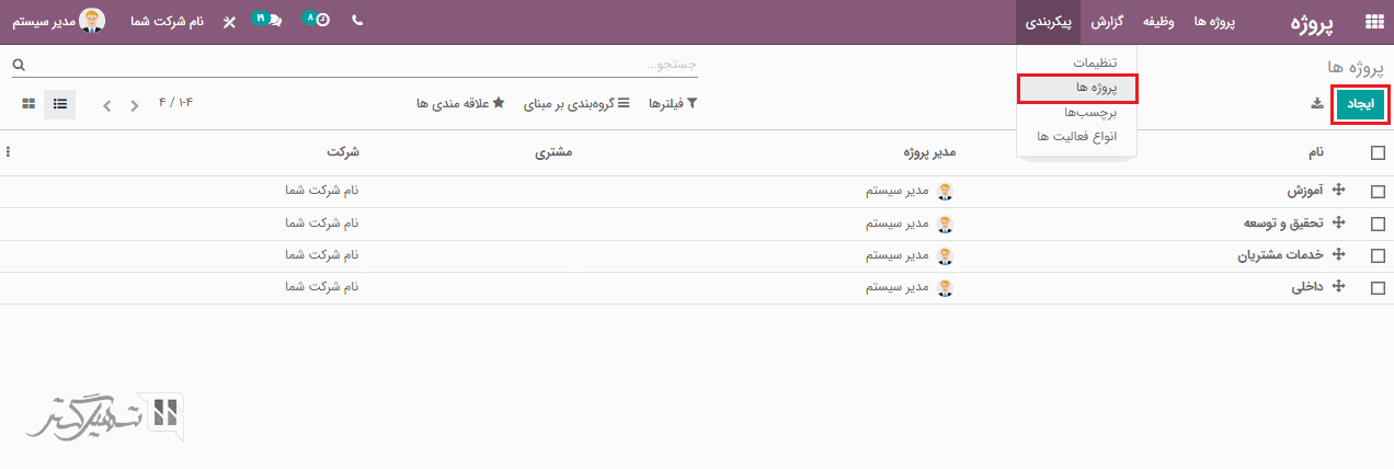بعد از کلیک بر روی دکمه "ایجاد" ، می توانید پروژه ای را که اکنون ایجاد کرده اید، در داشبورد مشاهده کنید. روش دیگر برای ایجاد یک پروژه جدید، رفتن به ماژول پروژه  ها> پیکربندی> پروژه ها> کلیک بر روی دکمه "ایجاد"،  است.