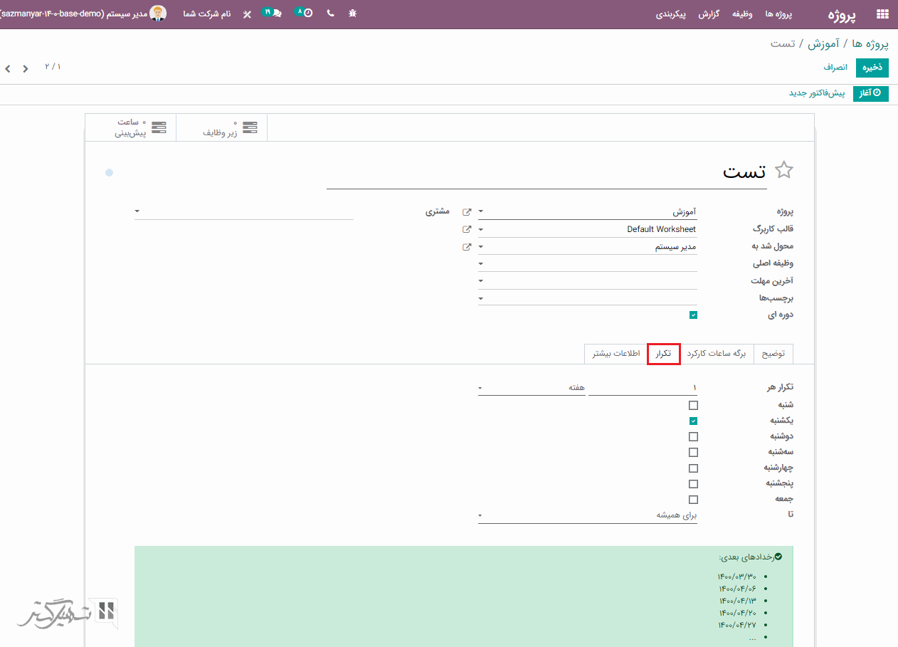 برای مدیریت وظایف تکرار شونده، ابتدا باید ویژگی "وظایف تکرار شونده" را از طریق ماژول پروژه ها> تنظیمات> پیکربندی> تب مدیریت وظایف ، فعال کرده و سپس بر روی دکمه "ذخیره" کلیک کنید.