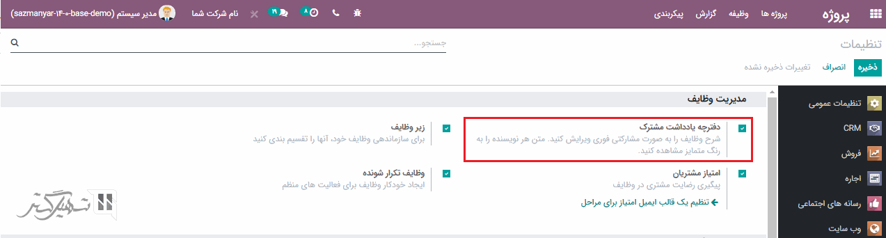 اودوو دفترچه یادداشت مشترکی را برای برقراری ارتباط با کاربران داخلی فراهم کرده است. هر کاربر زمانی که یافته های خود را به اشتراک می گذارد، می تواند رنگهای مختلفی برای شناسایی آسان، برای آنها تعریف کند. به ماژول پروژه ها> پیکربندی> تنظیمات> تب مدیریت وظایف بروید، و ویژگی "دفترچه یادداشت مشترک" را فعال کرده، سپس بر روی دکمه "ذخیره" کلیک کنید.
