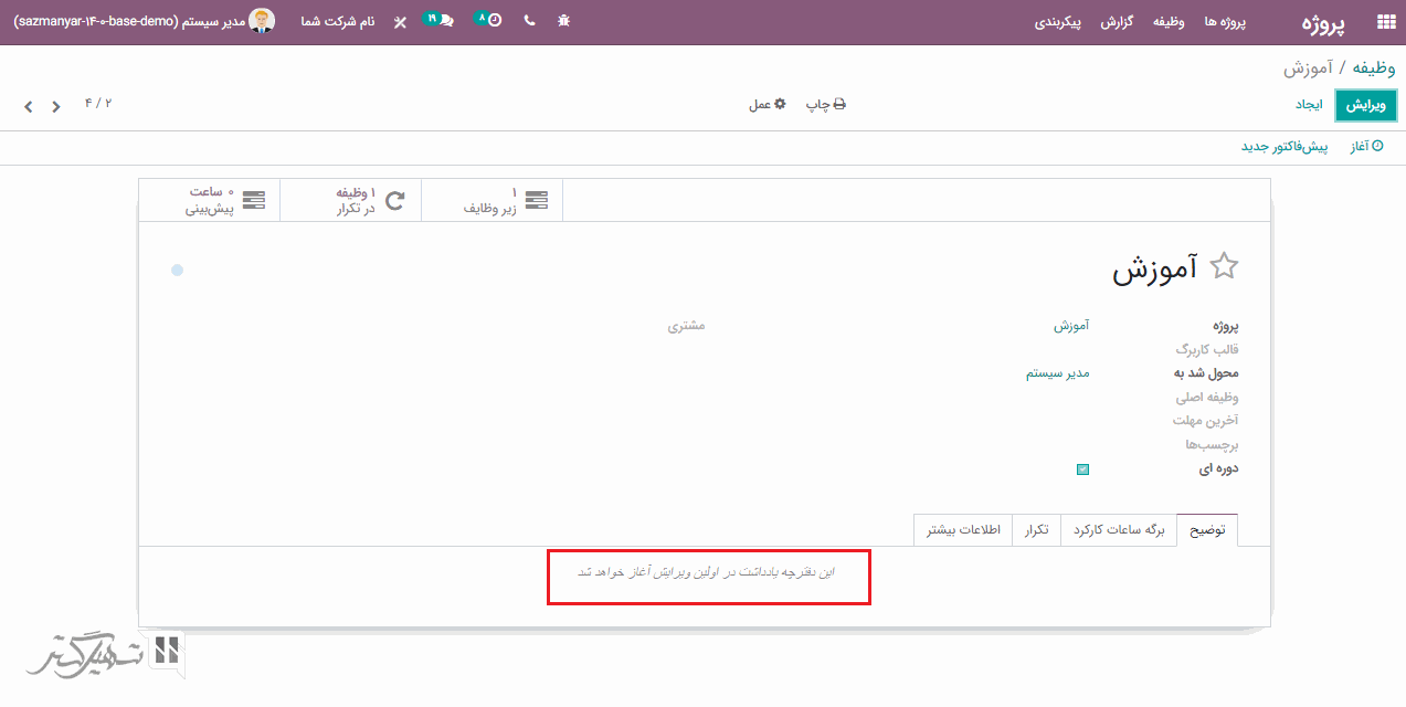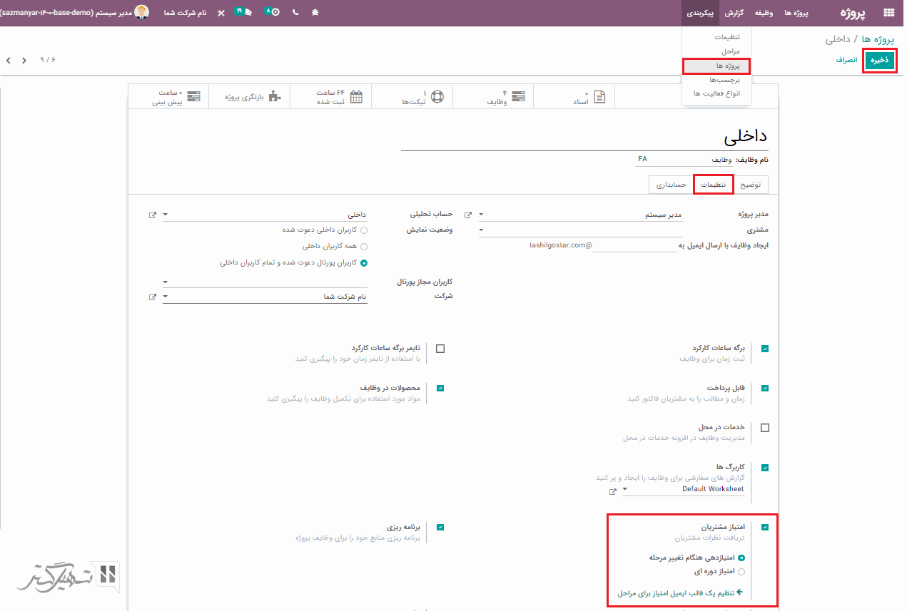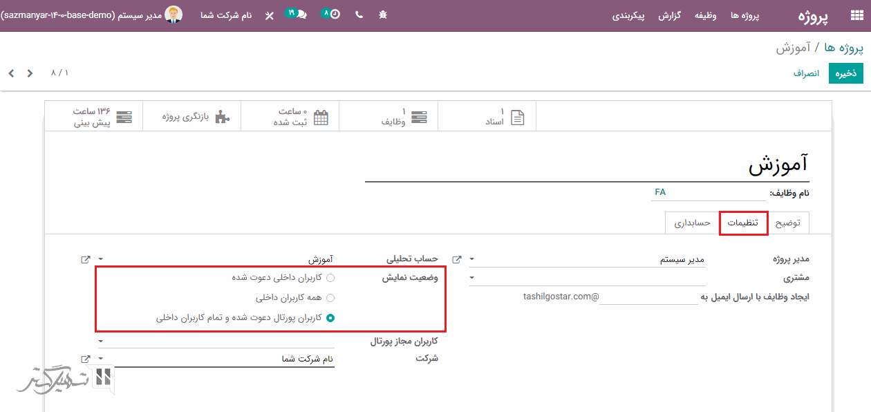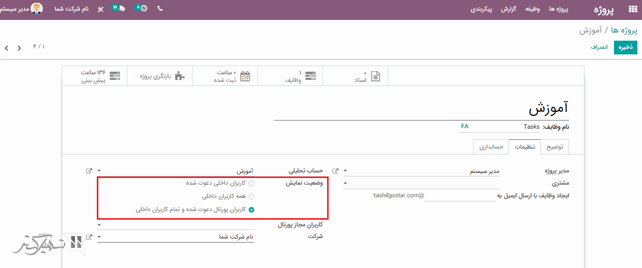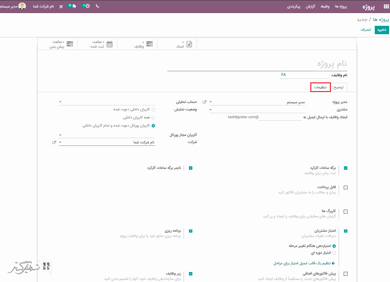 در صفحه ایجاد می توانید نام پروژه، نام وظایف را اضافه کنید، همچنین می توانید در تب تنظیمات ، می توانید برخی وِیژگی ها و فیلدها مانند مدیر پروژه، مشتری، حساب تحلیلی، وضعیت نمایش، کاربران مجاز پورتال، شرکت و  موارد دیگر را اضافه و پیکربندی کنید، سپس بر روی دکمه "ذخیره" کلیک نمایید: