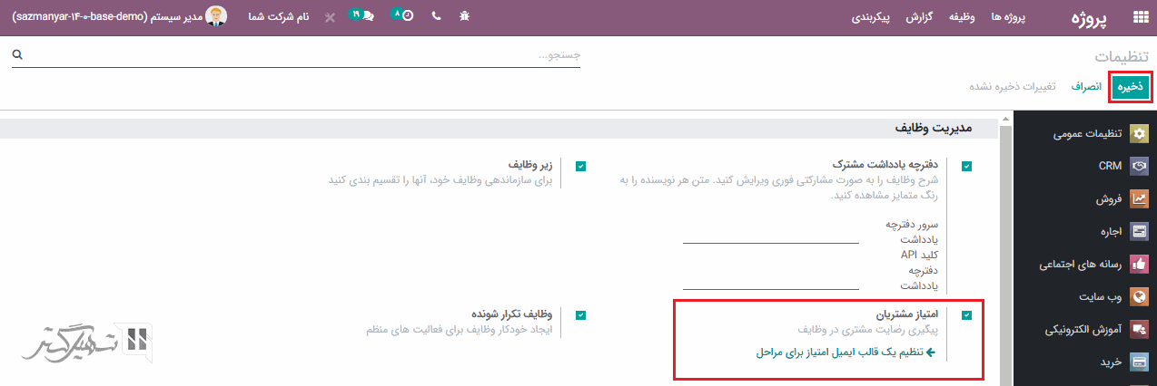 برای انجام این کار ابتدا باید ویژگی "امتیاز مشتریان" را از طریق ماژول پروژه ها> پیکربندی> تنظیمات> تب مدیریت وظایف فعال کرده، سپس بر روی دکمه "ذخیره" کلیک کنید: