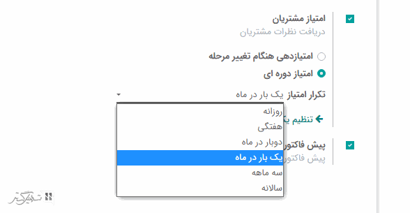 اکنون می توانید از طریق ماژول پروژه ها> پیکربندی> پروژه ها، امتیاز مشتریان را بر اساس "امتیاز دهی هنگام تغییر مرحله" و یا "امتیاز دوره ای" انتخاب نمایید: