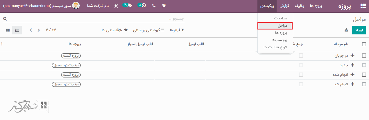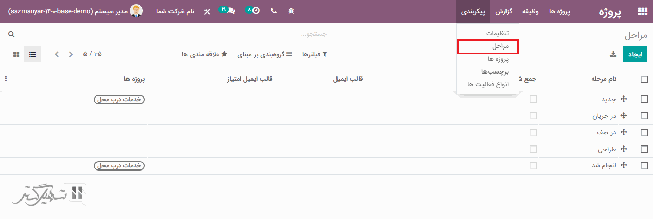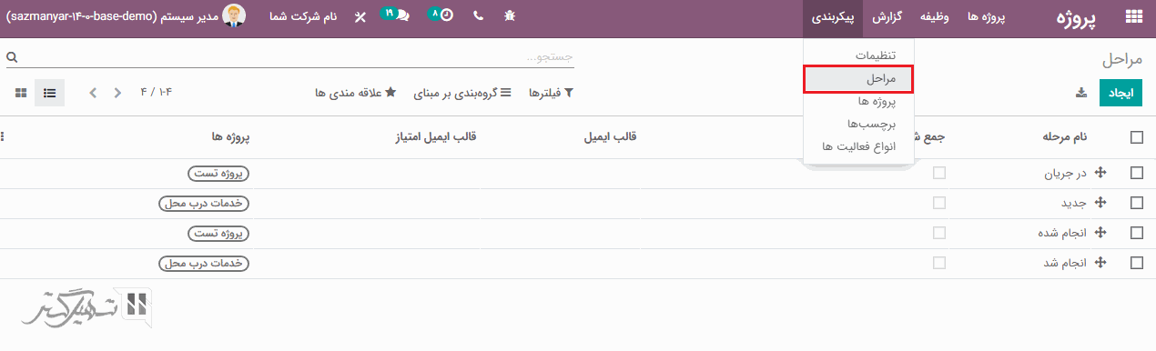 برای مدیریت وظیفه، ما باید وظایف را به مراحل مختلف انتقال دهیم. با ایجاد هر پروژه می توان مراحل مختلف مربوط به هر پروژه را داخل آن ایجاد کرد. مراحل را می توانید از طریق ماژول پروژه ها> پیکربندی> مراحل> کلیک بر روی دکمه "ایجاد"،  ایجاد کنید: