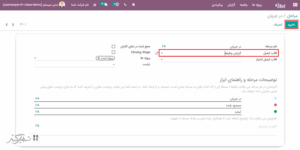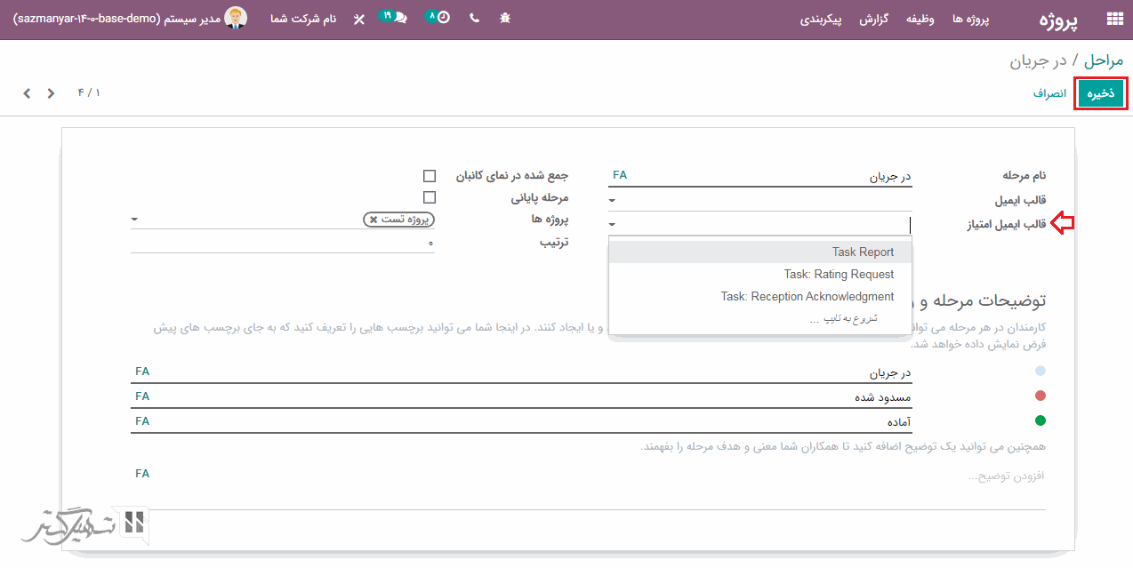 مرحله بعدی تنظیم "تنظیم یک قالب ایمیل امتیاز برای برای مراحل" است. به ماژول پروژه ها> پیکربندی> مراحل بروید، مرحله مورد نظر را ویرایش کرده و در فیلد "قالب ایمیل امتیاز" ، یک قالب ایمیل انتخاب کنید و بر روی دکمه "ذخیره" کلیک نمایید: