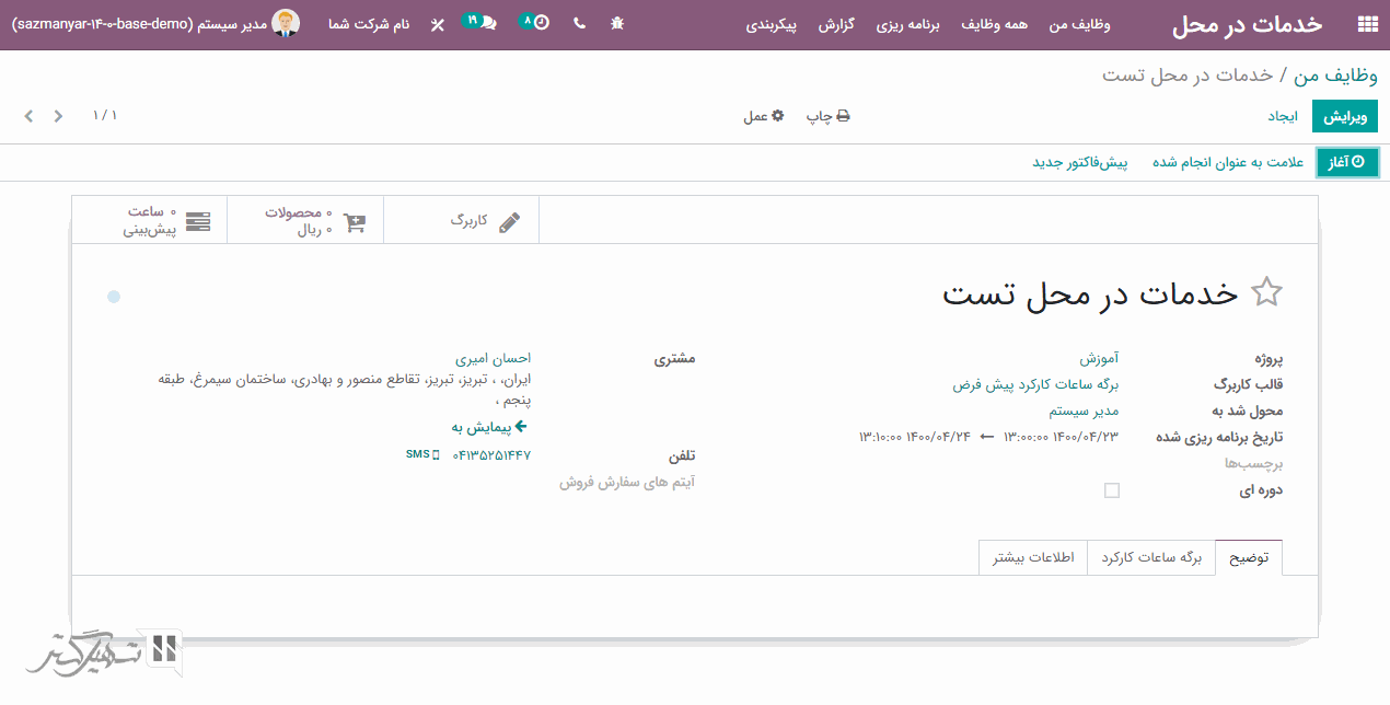 به ماژول خدمات در محل بروید و بر روی دکمه "ایجاد" کلیک کنید. در فرم ایجاد، نام درخواست خدمات در محل، پروژه، نام شخصی که این وظیفه قرار است به او محول شود، مشتری، تاریخ های برنامه ریزی شده و غیره را اضافه کنید و سپس تغییرات را ذخیره نمایید: