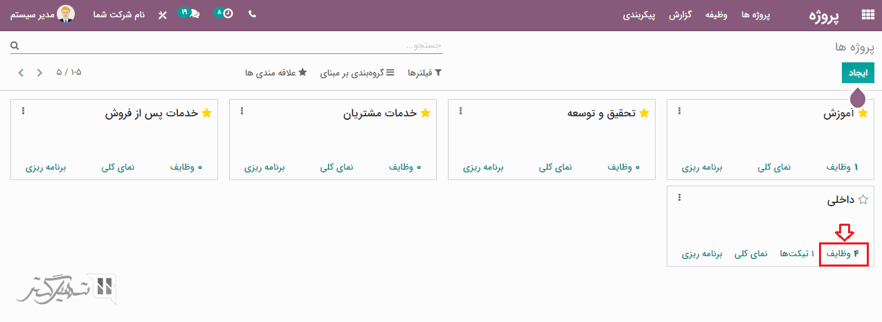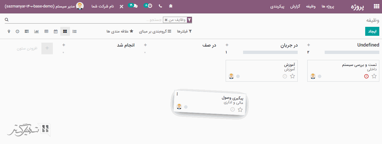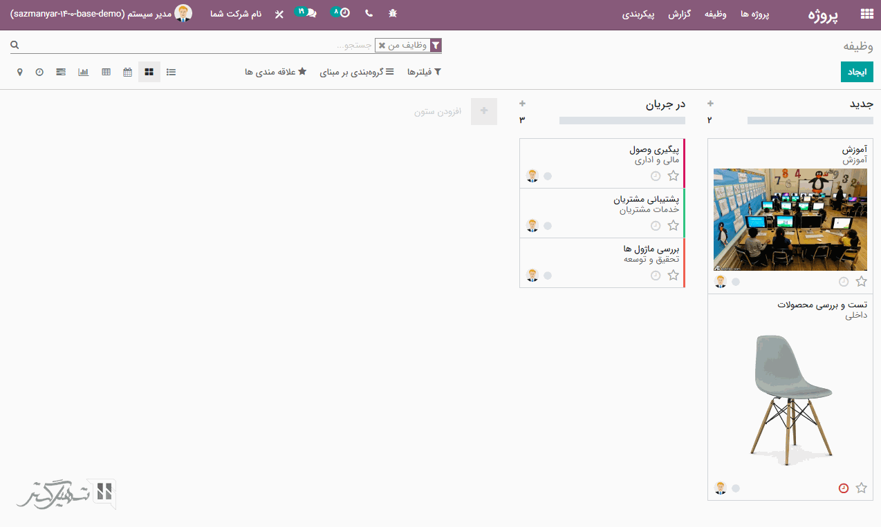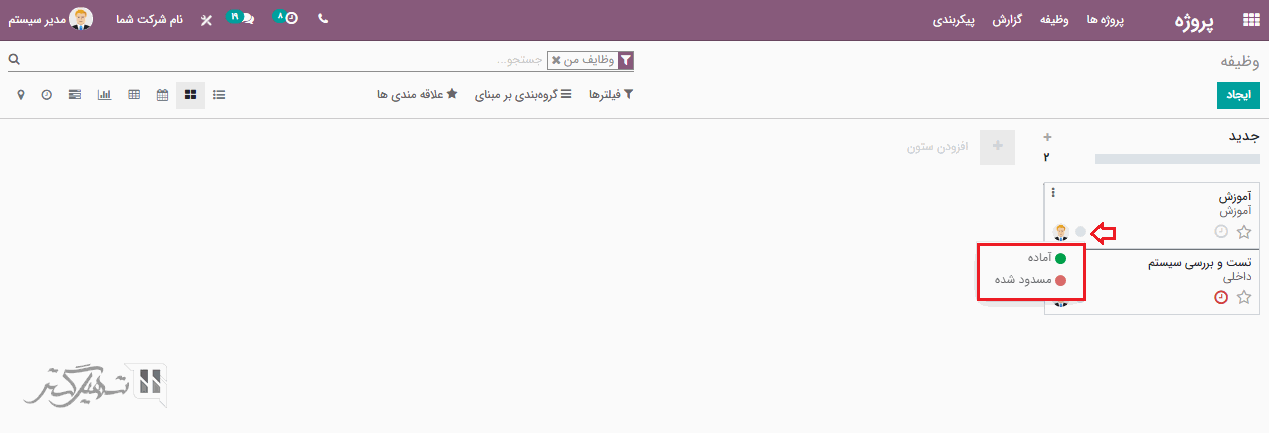 به ماژول پروژه ها> وظیفه بروید و نمای کانبان  را انتخاب نمایید: