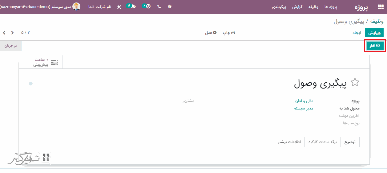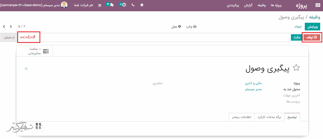 کارمندان می توانند ساعات کارکرد خود را به صورت دستی اضافه کنند یا از ویژگی جدید "تایمر"  که به طور خودکار ساعات کارکرد کارمندان را محاسبه و ثبت می کند، استفاده کنند. زمانی که یک وظیفه را باز می کنید، در بالای صفحه یک دکمه "آغاز" وجود دارد. اگر هنگام شروع کار، بر روی آن کلیک نمایید، زمان صرف شده برای وظیفه ثبت خواهد شد.