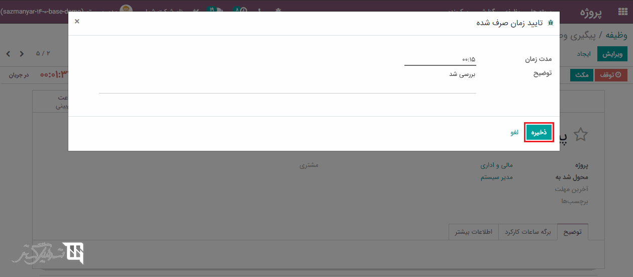 بعد از اتمام کار، اگر بر روی دکمه  "توقف" کلیک کنید، یک ویزارد مانند تصویر زیر در صفحه ظاهر خواهد شد، که در آن مدت زمان  به طور خودکار پر شده است، فقط کافی است در فیلد توضیحات، توضیحات کارهایی که برای این وظیفه مربوطه انجام داده اید، اضافه نمایید و بر روی دکمه "ذخیره" کلیک کنید: