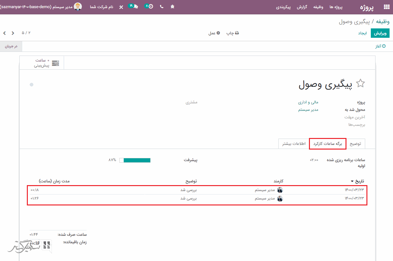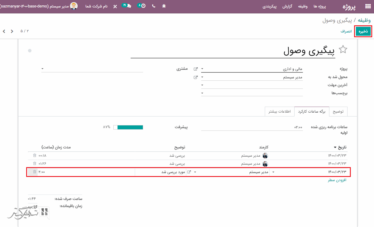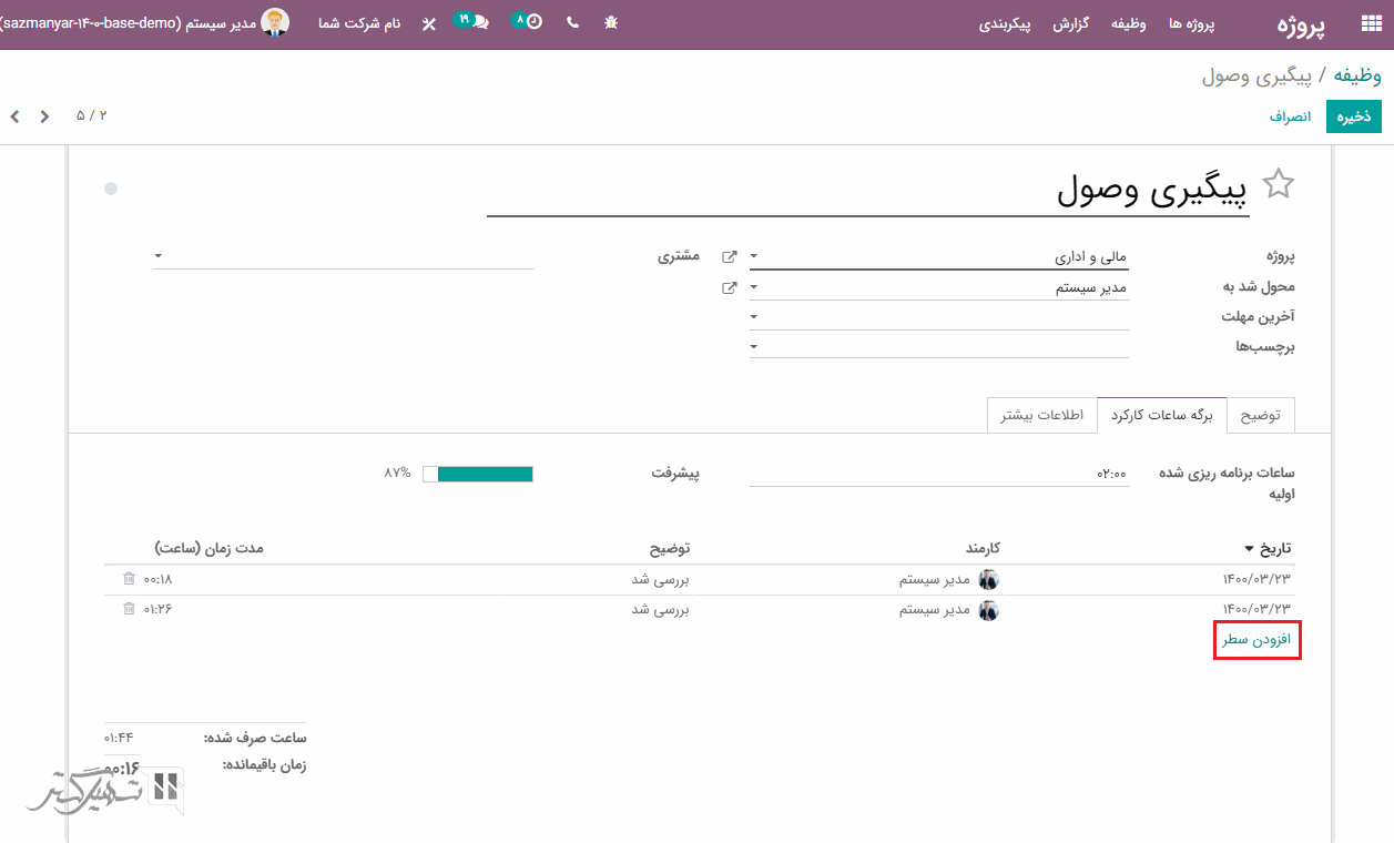 برای افزودن برگه ساعات کارکرد به صورت دستی، به وظایف بروید و وظیفه مورد نظر را ویرایش کنید، در تب برگه ساعات کارکرد، بر روی "افزودن سطر" کلیک کرده و جزئیاتی مانند تاریخ، کارمند، توضیح و مدت زمان صرف شده را اضافه نمایید، سپس بر روی دکمه "ذخیره" کلیک کنید.