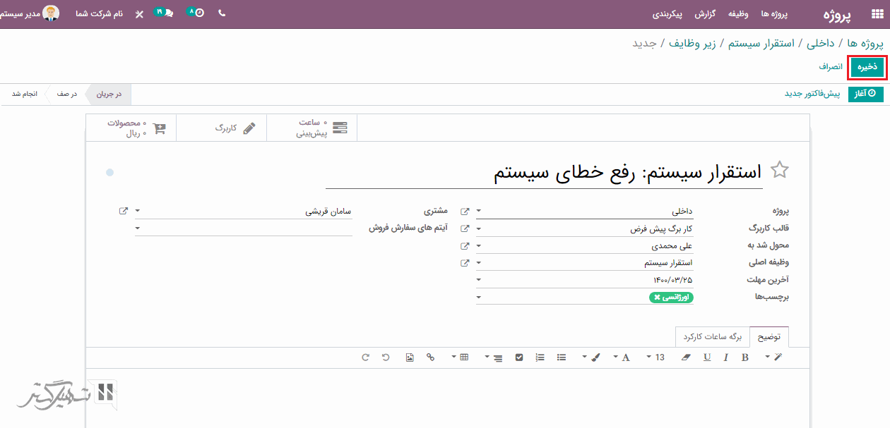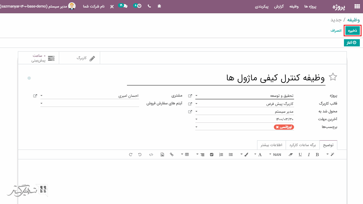 در فرم ایجاد، جزئیاتی مانند نام وظیفه، شخصی که این وظیفه به او محول می شود، پروژه، قالب کاربرگ و غیره را اضافه کرده و بر روی دکمه "ذخیره"  کلیک کنید: