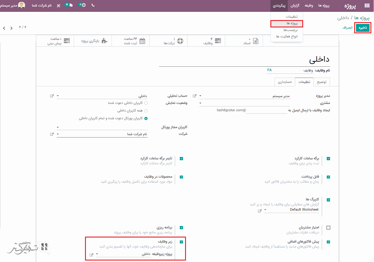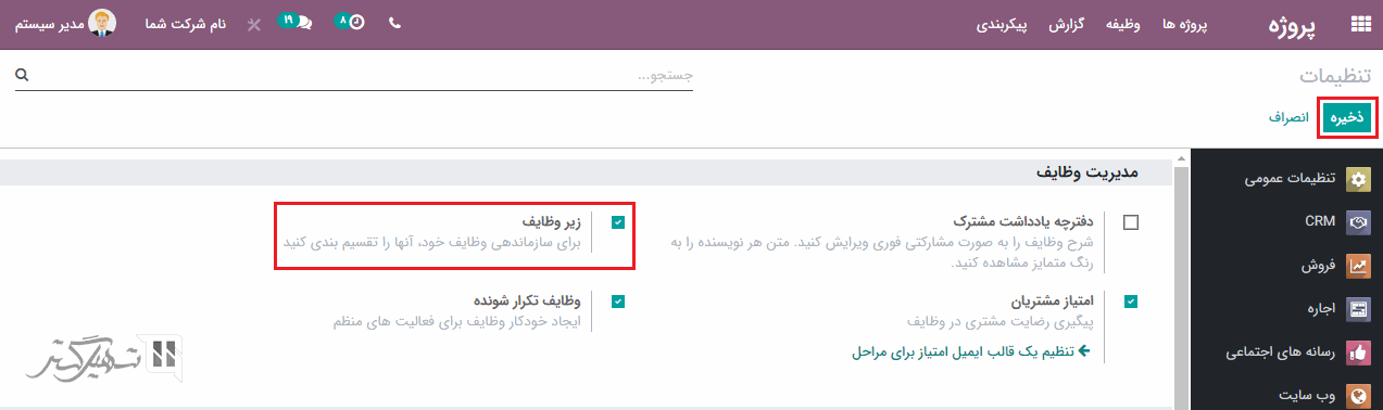 برای مدیریت زیر وظایف، ابتدا باید ویژگی زیر وظایف را از طریق ماژول پروژه> پیکربندی> تنظیمات> تب مدیریت وظایف ، فعال کرده و بر روی دکمه "ذخیره" کلیک کنید:
