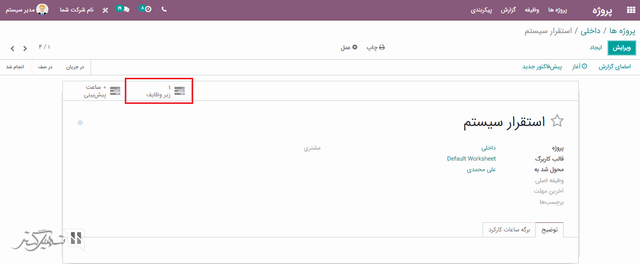برای ایجاد زیر وظایف جدید، به وظایف بروید و وظیفه ای را که می خواهید برای آن زیر وظایف تعریف کنید، باز کرده و بر روی دکمه "زیر وظایف"  کلیک کنید: