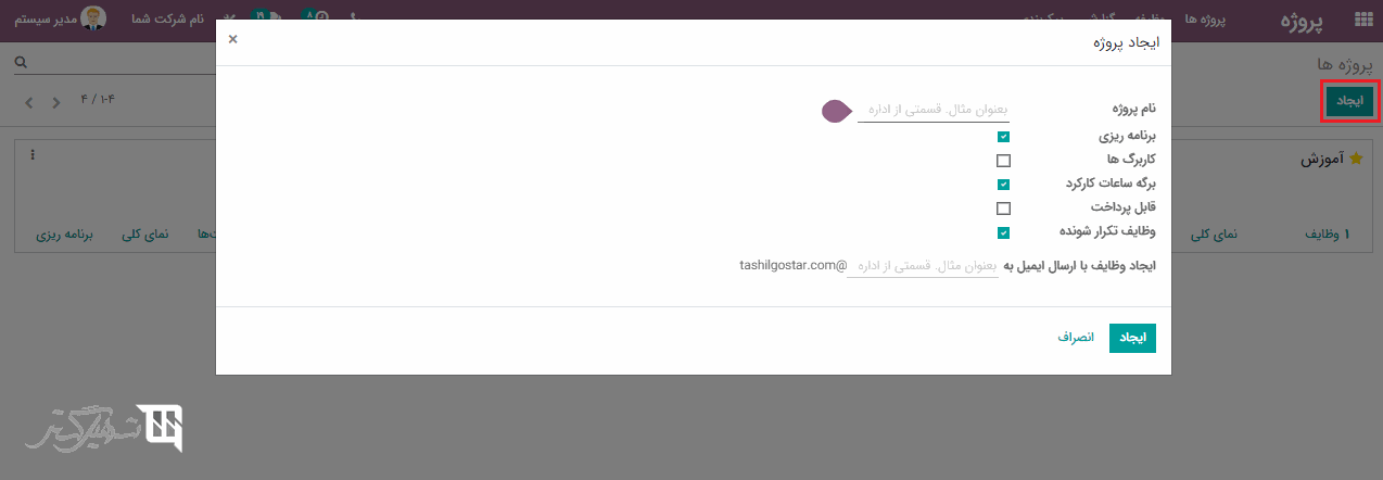 برای ایجاد پروژه جدید، می توانید از طریق داشبورد ماژول پروژه ها، بر روی دکمه "ایجاد" کلیک کنید، سپس در ویزارد باز شده، نام پروژه، ویژگی های مورد نیاز پروژه مانند برنامه ریزی، کاربرگ ها، برگه ساعات کارکرد، قابل پرداخت و وظایف تکرار شونده را اضافه کرده و بر روی دکمه "ایجاد" کلیک کنید: