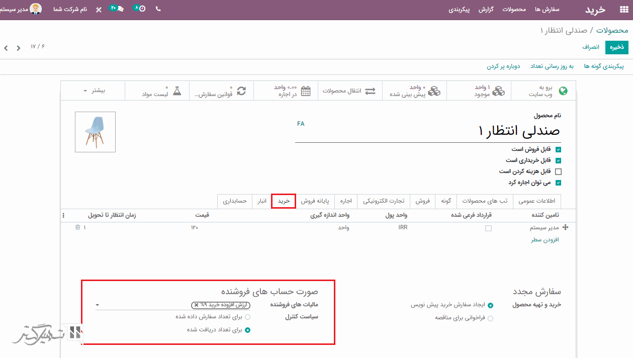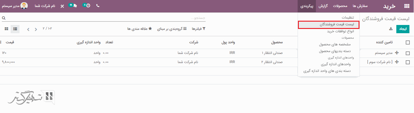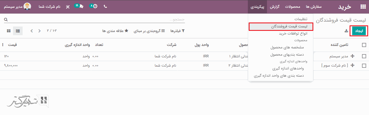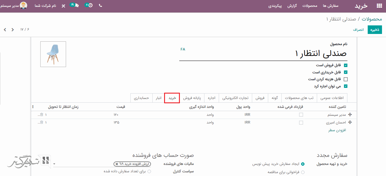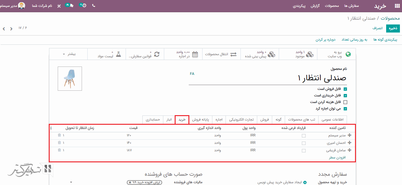 بله ، از طریق ماژول خرید> محصولات> محصولات> تب خرید ، می توانید لیست تامین کنندگان را اضافه نمایید. همچنین می توانید قیمت های مختلفی را برای هر تامین کننده تعریف کنید: