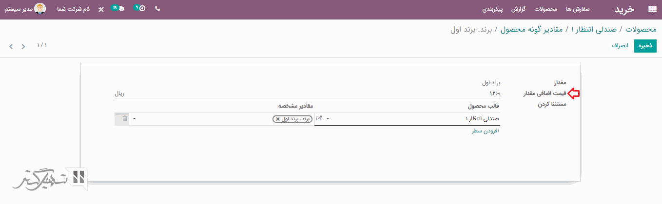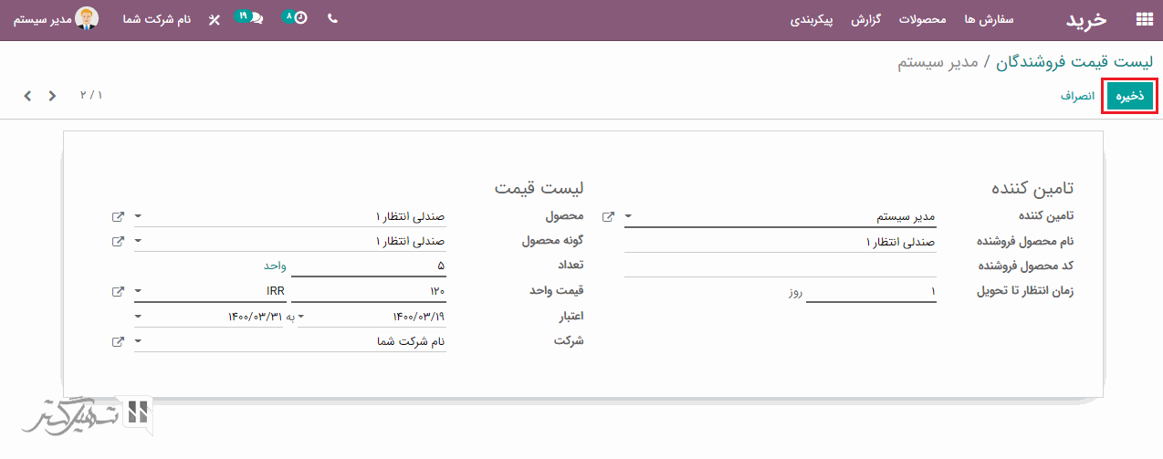 سپس در فرم ایجاد، تامین کننده، نام محصول فروشنده، زمان انتظار تا تحویل، قیمت واحد، اعتبار و غیره را اضافه کرده و بر روی دکمه "ذخیره" کلیک کنید. بعد از پیکربندی، در صورت خریداری این محصول توسط فروشنده، قیمت براساس قیمت تعریف شده در لیست قیمت فروشنده محاسبه خواهد شد.