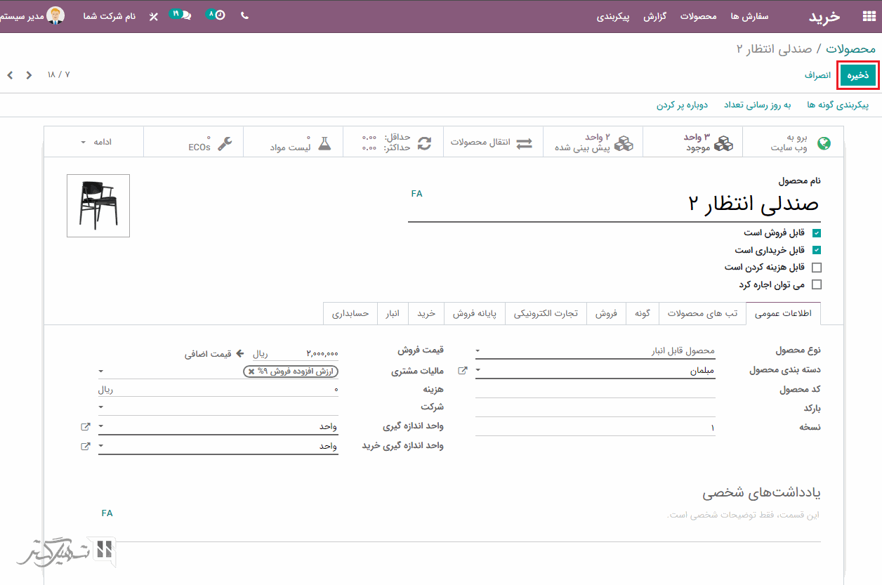 در فرم ایجاد می توانید فیلدهای الزامی از جمله نام محصول، نوع محصول، دسته بندی، واحد اندازه گیری، واحد اندازه گیری خرید، هزینه و غیره را وارد نمایید، سپس بر روی دکمه "ذخیره" کلیک کنید: