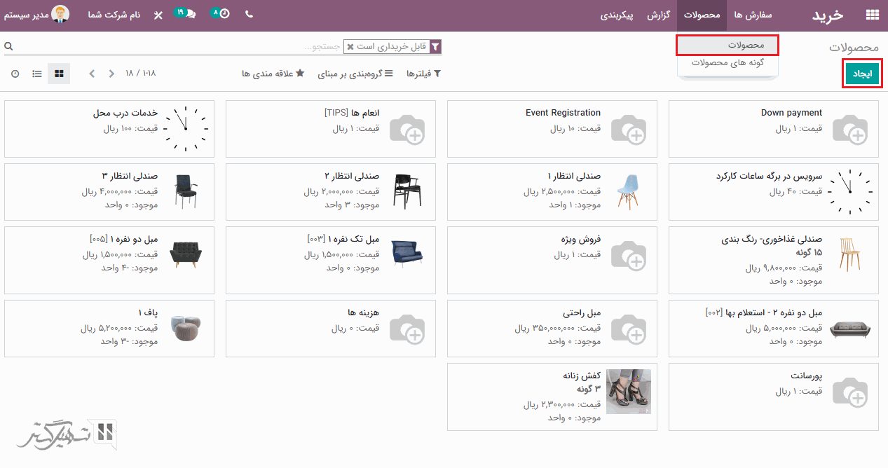 به ماژول خرید> محصولات> محصولات بروید و بر روی دکمه "ایجاد" کلیک کنید: