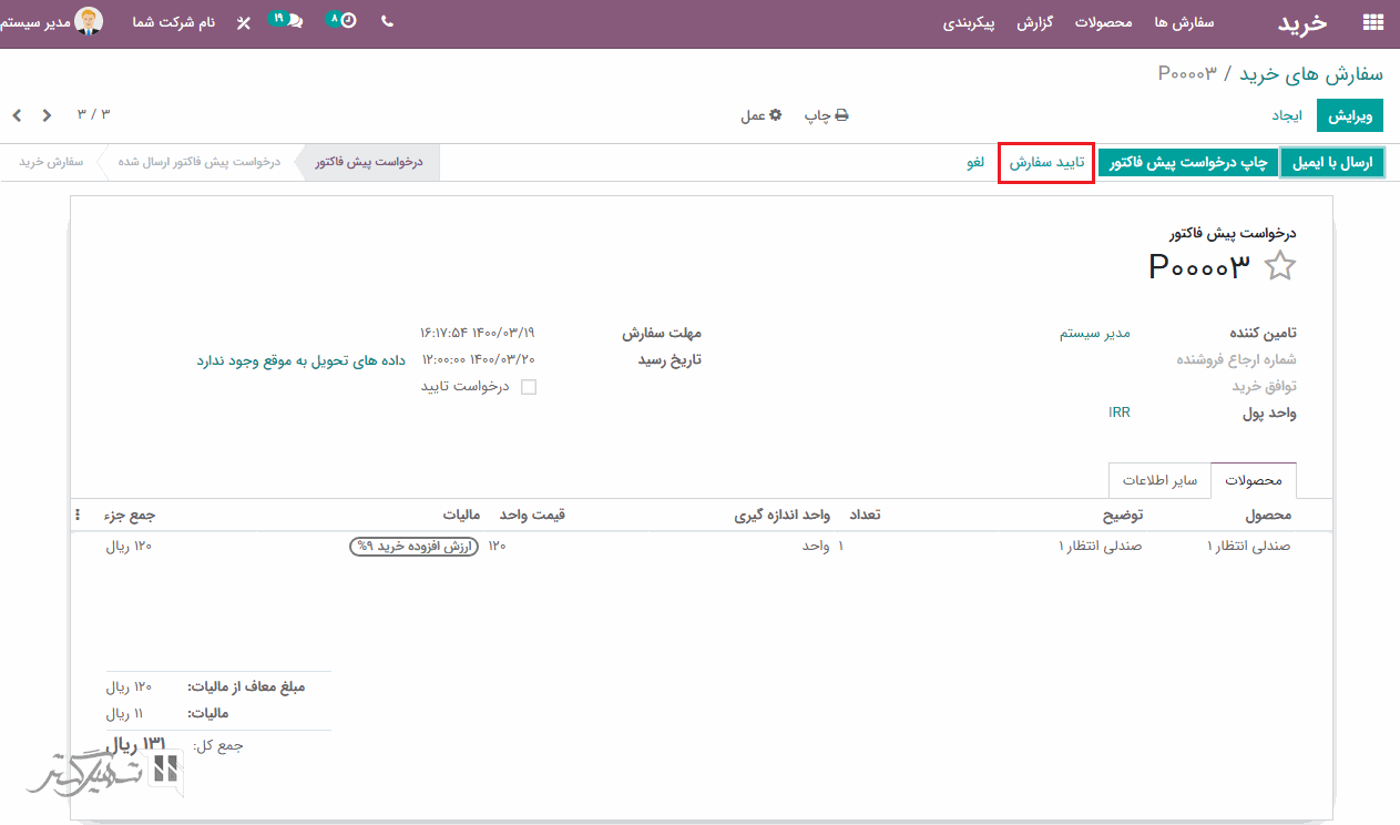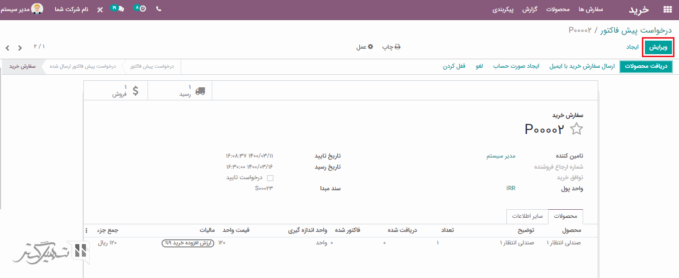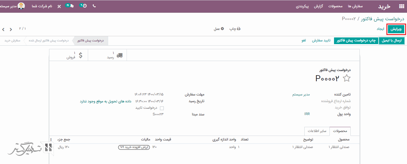 اکنون می توانید با کلیک بر روی دکمه "ویرایش" ، تغییرات مورد نظر را در درخواست پیش فاکتور اعمال کرده و آن را تایید کنید، سپس به فروشنده مربوطه ارسال نمایید.