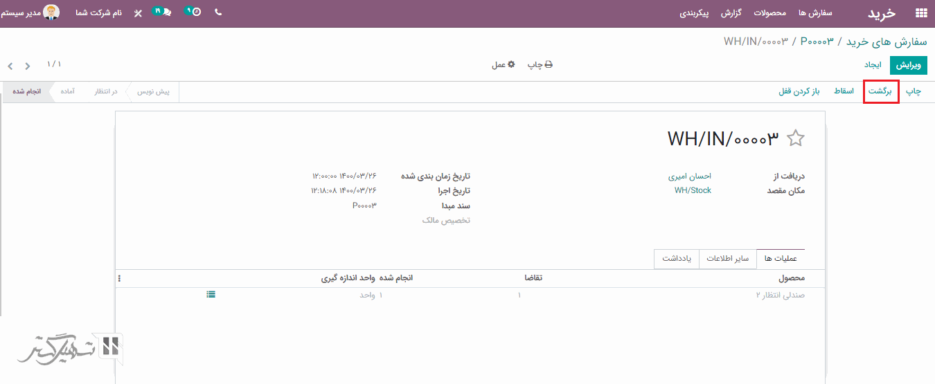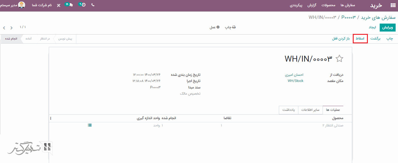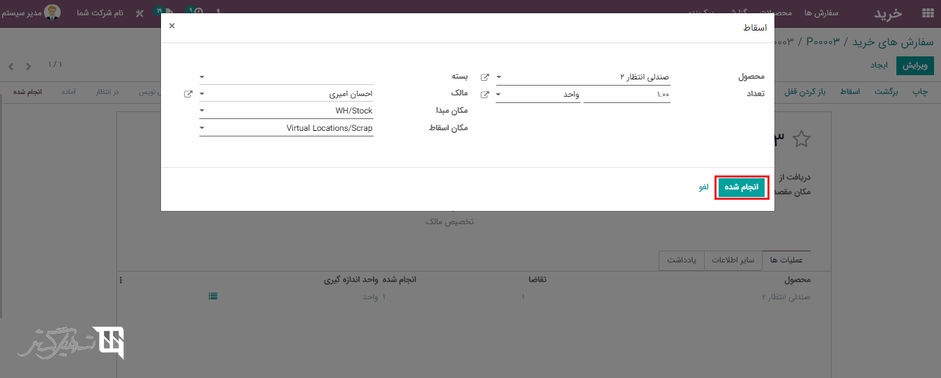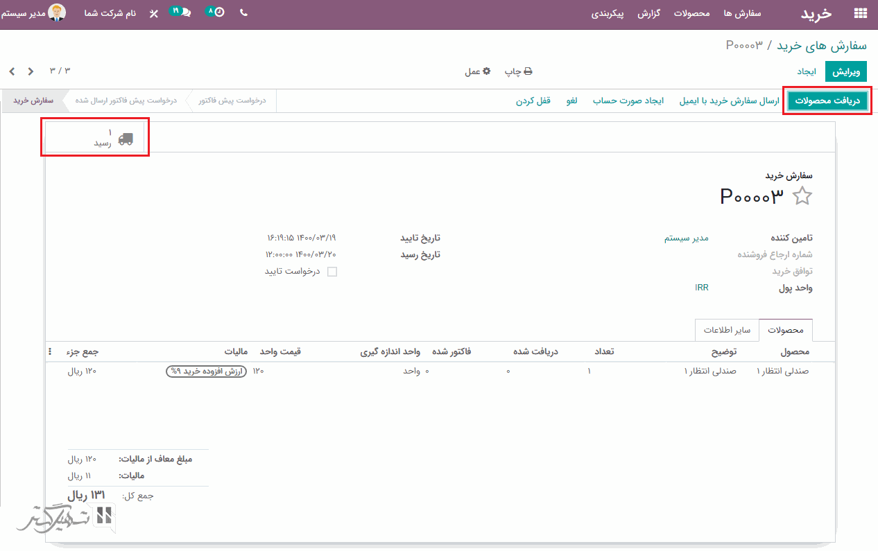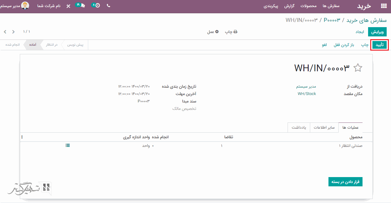 همچنین، می توانید با کلیک بر روی دکمه "دریافت محصولات" موجود در سفارش خرید، تاریخ رسید را تایید کنید. اکنون بعد از کلیک بر روی دکمه "تایید" ، محصول خریداری شده به مکان انبار انتقال خواهد یافت: