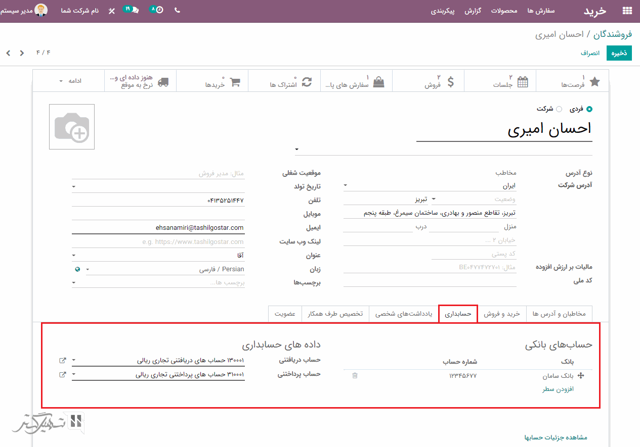 در فرم فروشنده> تب حسابداری، جزئیات حسابداری فروشنده از جمله حساب های دریافتنی و پرداختنی، جزئیات حساب بانکی را می توان اضافه کرد: