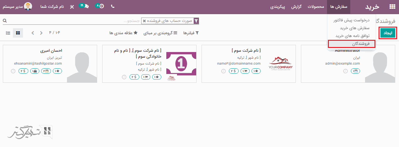 برای ایجاد فروشندگان، به ماژول خرید> سفارش ها> فروشندگا ن بروید و بر روی دکمه "ایجاد" کلیک کنید: